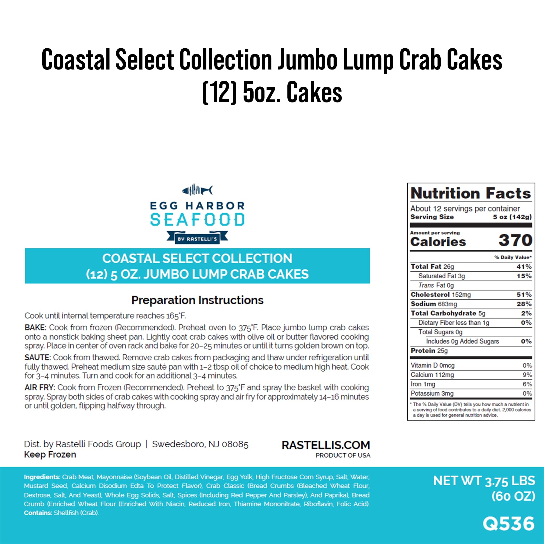 Q: What is the size and packaging of the crab cakes?A: Each package contains 12 individually vacuum-sealed 5 oz Jumbo Lump Crab Cakes, totaling 3.75 lbs. This packaging ensures freshness and makes it easy to prepare just the right amount.
