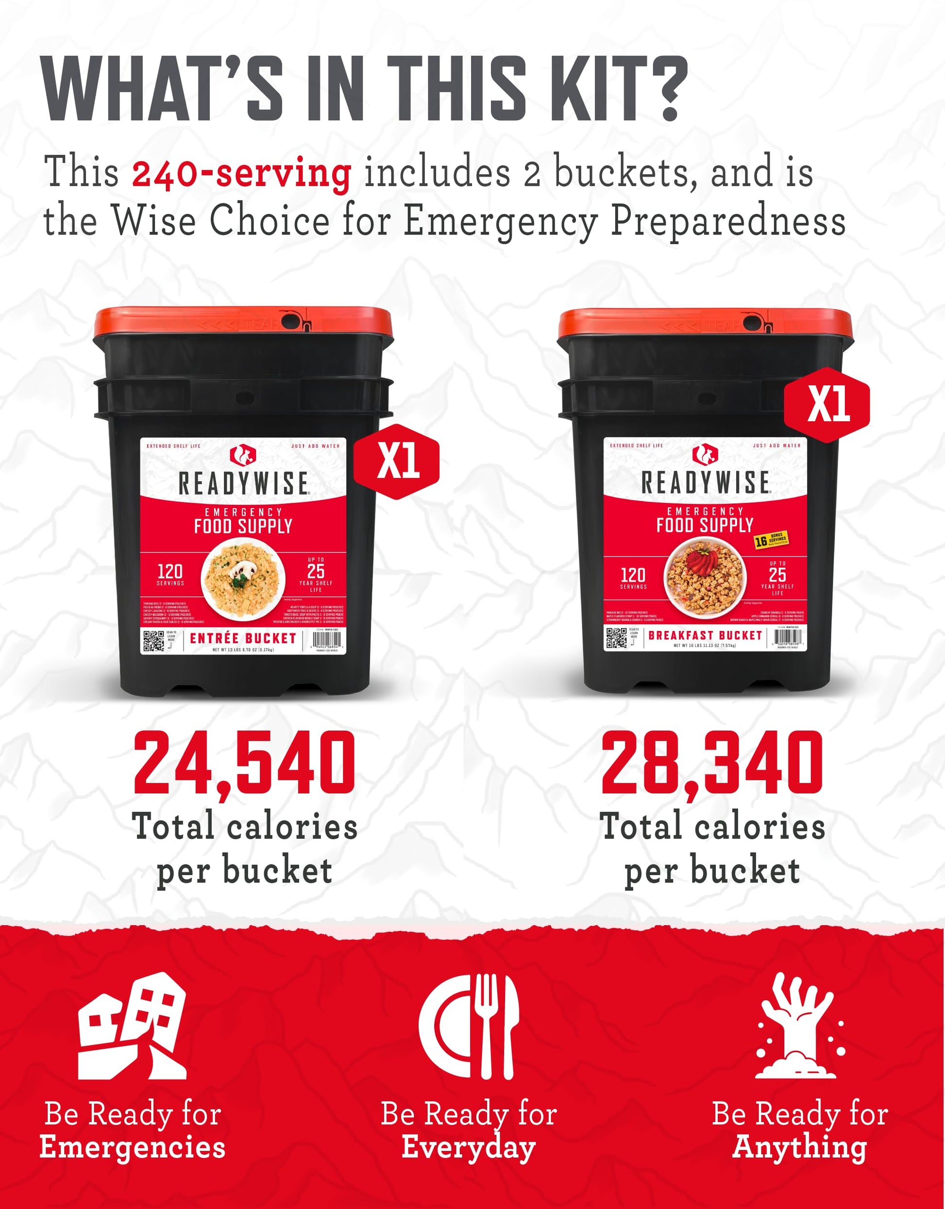 Q: How many servings are included in the ReadyWise food supply?A: This emergency food kit includes a total of 240 servings, providing a diverse range of meals to sustain you during a crisis.