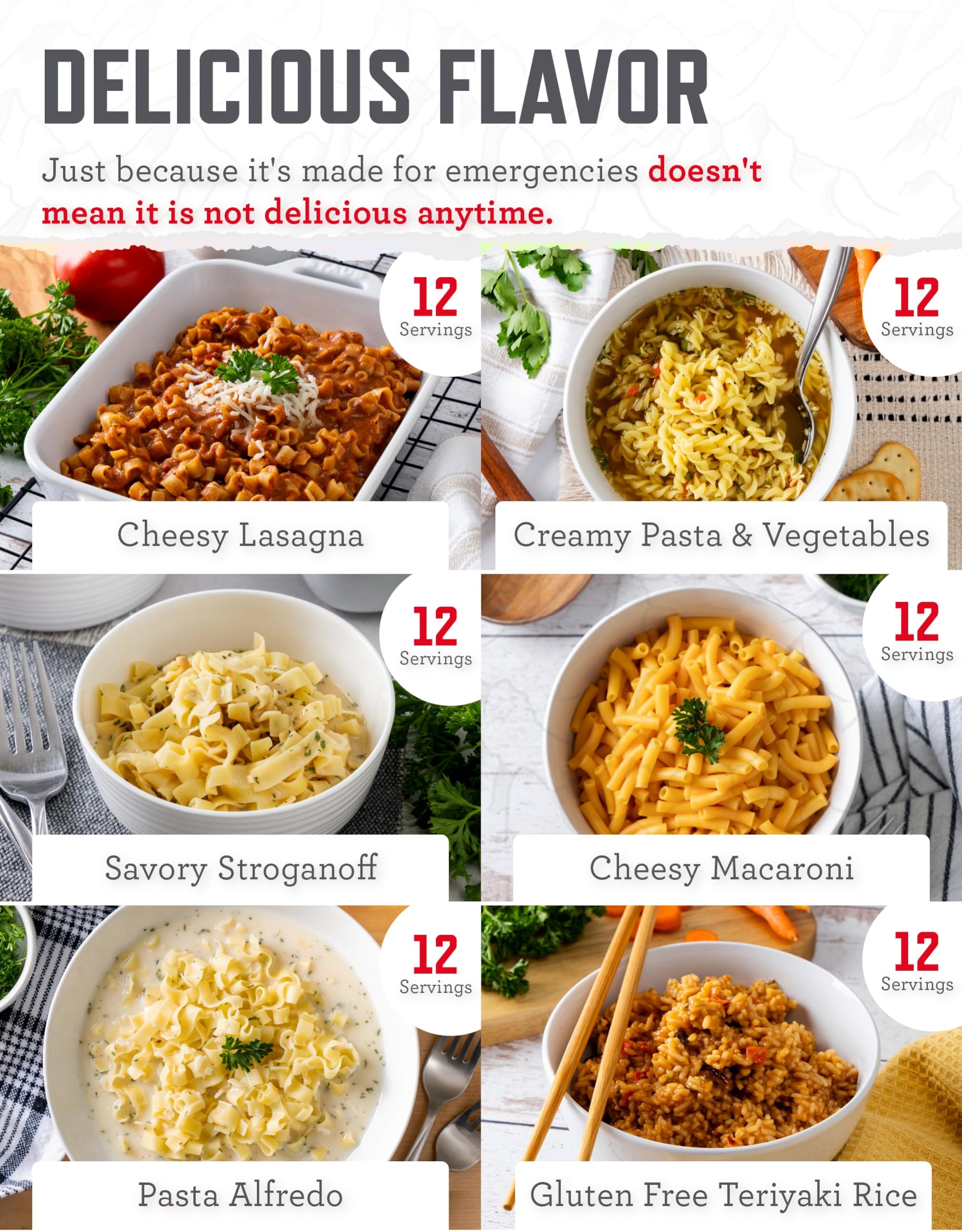 Q: What types of meals can I expect from the ReadyWise Emergency Food Supply?A: The ReadyWise kit features a delicious variety of meals, including hearty soups and savory pastas, all made from real ingredients, ensuring you don't compromise on taste even in emergencies.