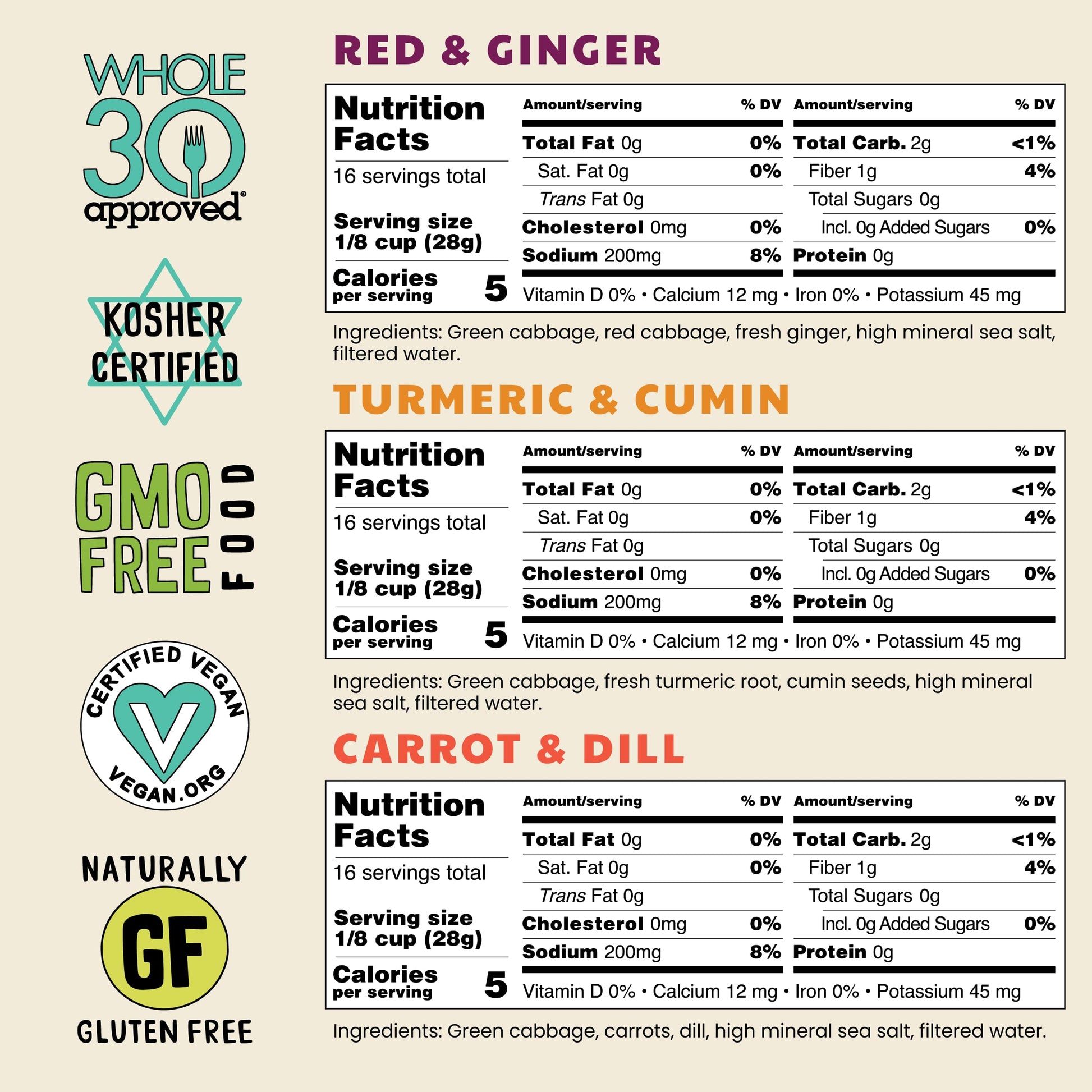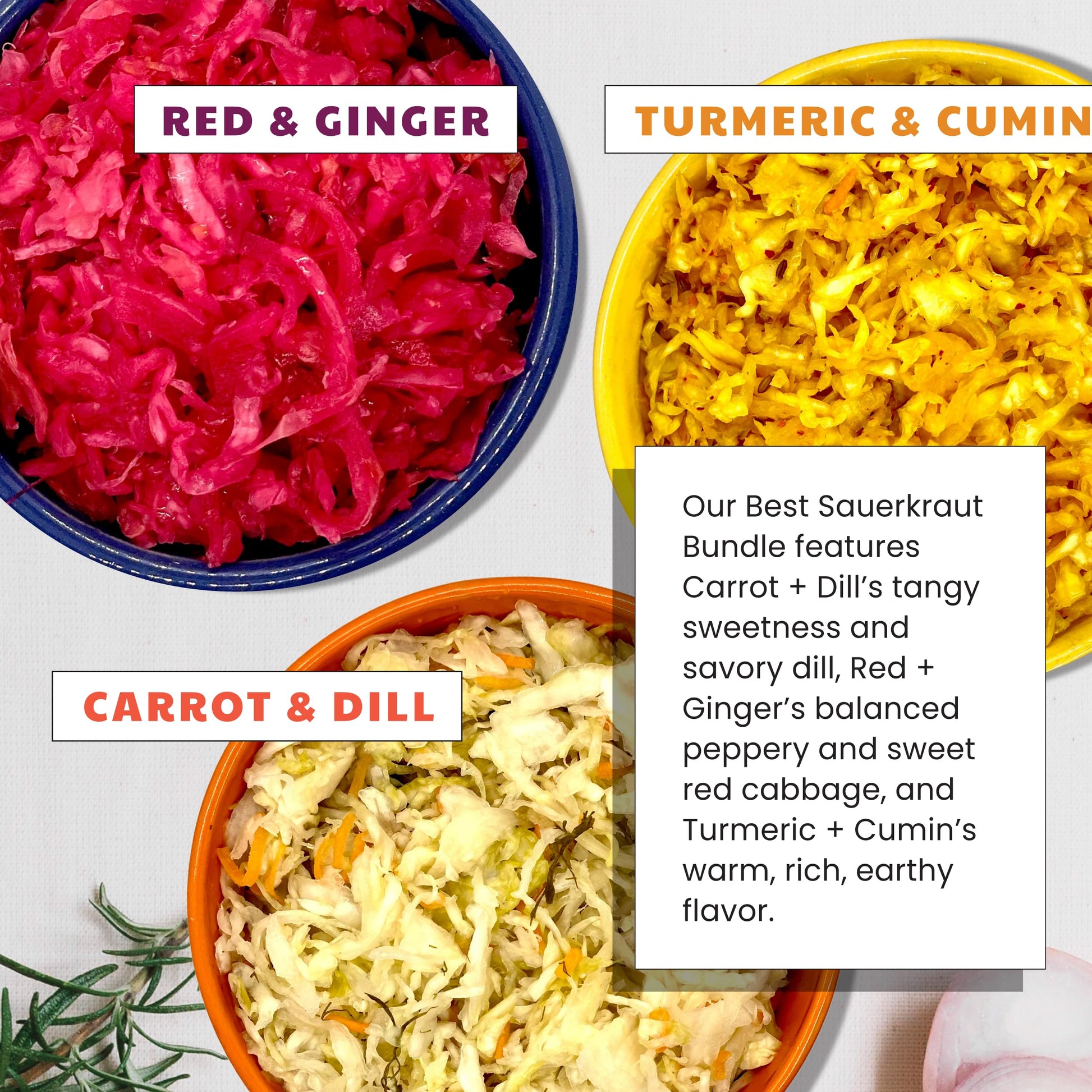 - Q: What are the different flavors included in the TOP KRAUT BUNDLE? A: The TOP KRAUT BUNDLE includes three delicious flavors: Carrot & Dill, Classic Caraway, and Ginger & Red Cabbage. Each flavor offers a unique twist on traditional sauerkraut, making it perfect for a variety of dishes.