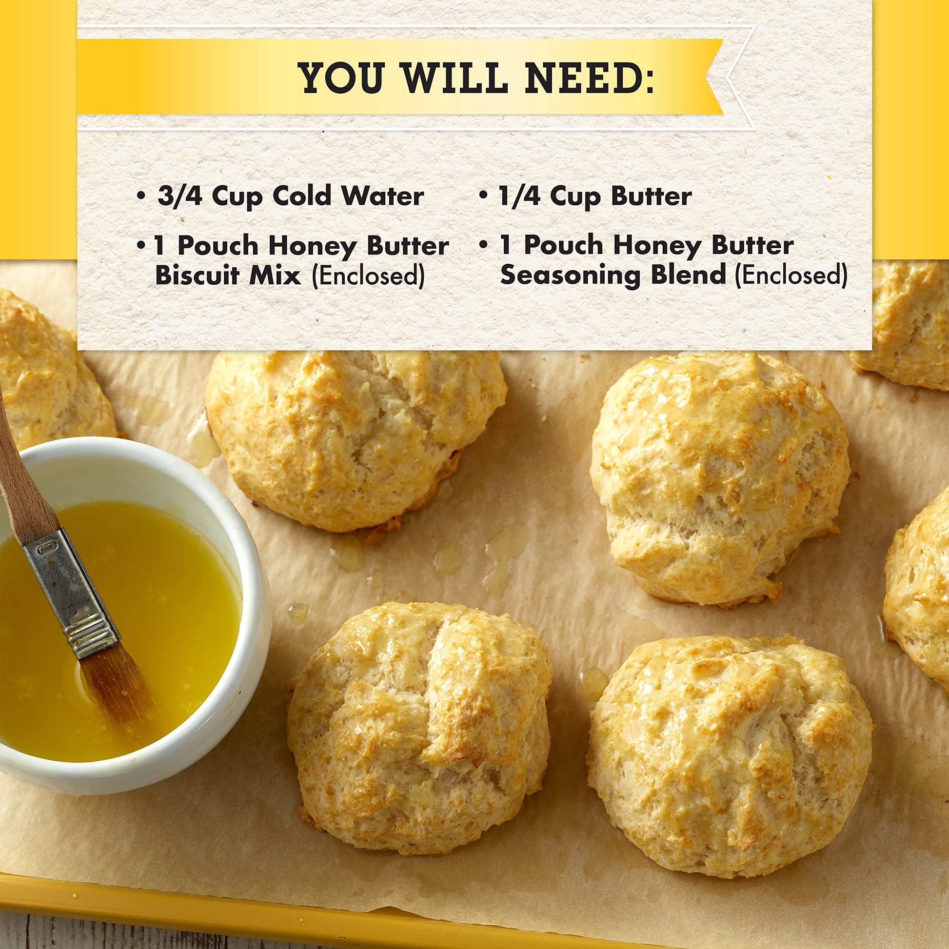 Q: How do you prepare the Honey Butter Biscuits from this mix?A: To prepare the Honey Butter Biscuits, simply add water to the mix, bake according to the instructions, and before serving, combine the contents of the honey butter pouch with melted butter and brush it over the freshly baked biscuits.