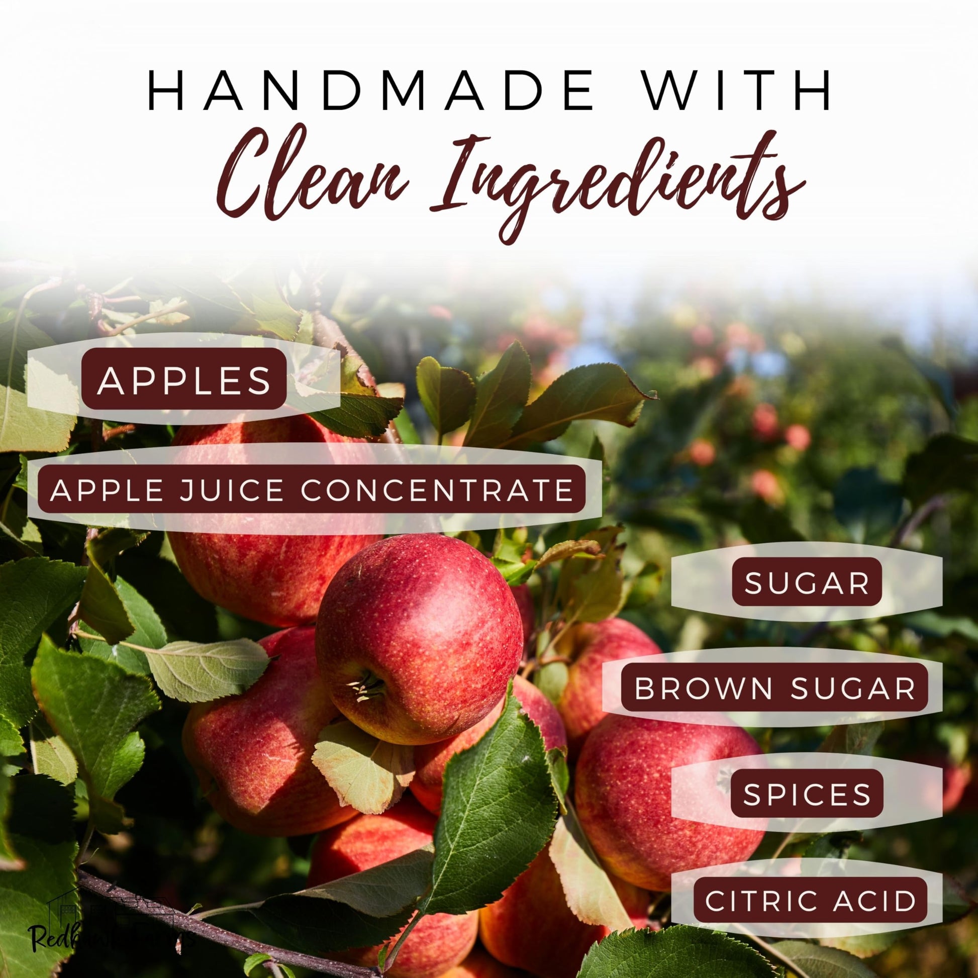 Q: What are the main ingredients in Redhawk Farms Apple Butter?A: Redhawk Farms Apple Butter is made from a simple blend of natural ingredients: apples, sugar, apple juice concentrate, brown sugar, salt, spices, and citric acid. This ensures a delicious and authentic flavor without any artificial additives.