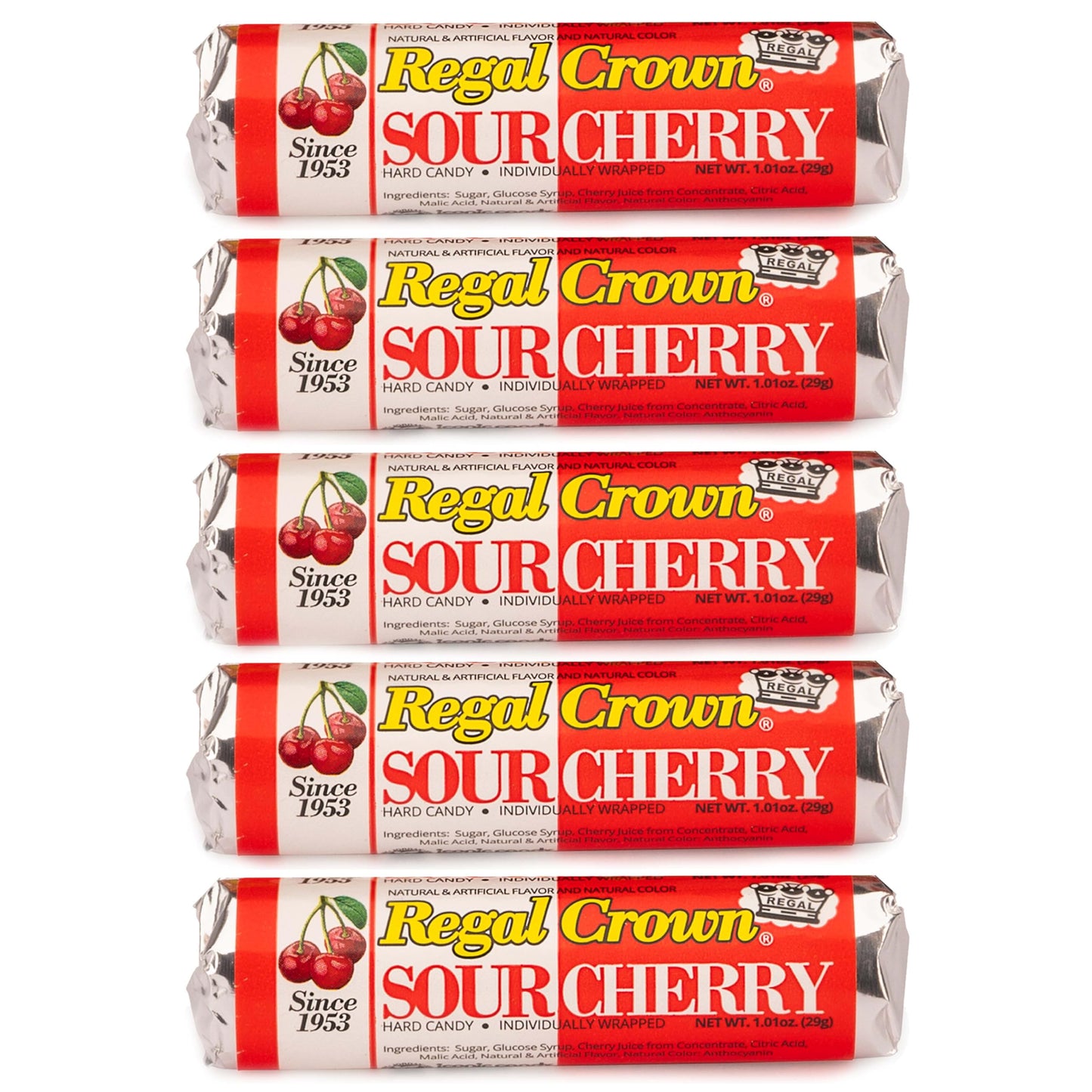 - Q: What is the size of the Regal Crown Roll Sour Cherry candy pack? A: The Regal Crown Roll Sour Cherry candy pack includes five rolls, with each roll weighing 1.01 ounces.