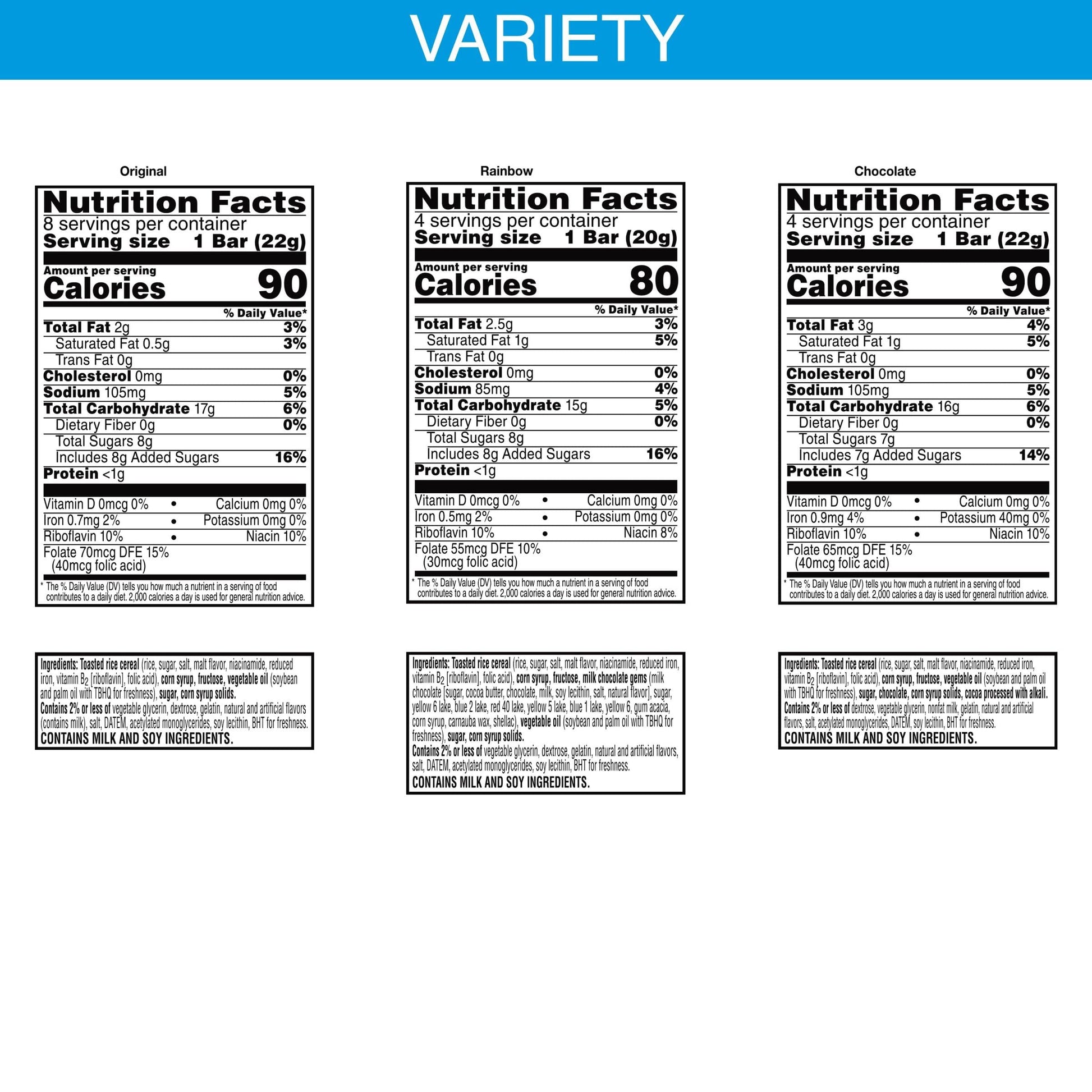 Enjoy The Fun Of Everyday Moments With The Irresistible Taste Of Rice Krispies Treats Crispy Marshmallow Squares. This Variety Pack Includes Original, Chocolate, And Rainbow Flavors. Create Memorable Moments With Each And Every Delectable Square That Pulls Apart To Reveal Ooey, Gooey Goodness. Made With Crispy Rice Cereal And The Taste Of Soft Marshmallows, Each Bar Is A Delicious, Ready-To-Eat Treat Wherever You Go; A Classically Delicious Treat, These Individually Wrapped Marshmallow Bars Are Perfect For Enjoying Together. Enjoy At Home Or Take A Few With You For Traveling, Lunchtime, At The Game, Or Pack For School Snacks. They'Re Easy Snacks To Share With Friends And Family. Make Someone'S Day By Adding Rice Krispies Treats Crispy Marshmallow Cereal Bars To Goodie Bags, Gift Baskets, And Care Packages. Satisfy Your Sweet Craving With The Goodness And On-The-Go Convenience Of Rice Krispies Treats Original Crispy Marshmallow Squares.