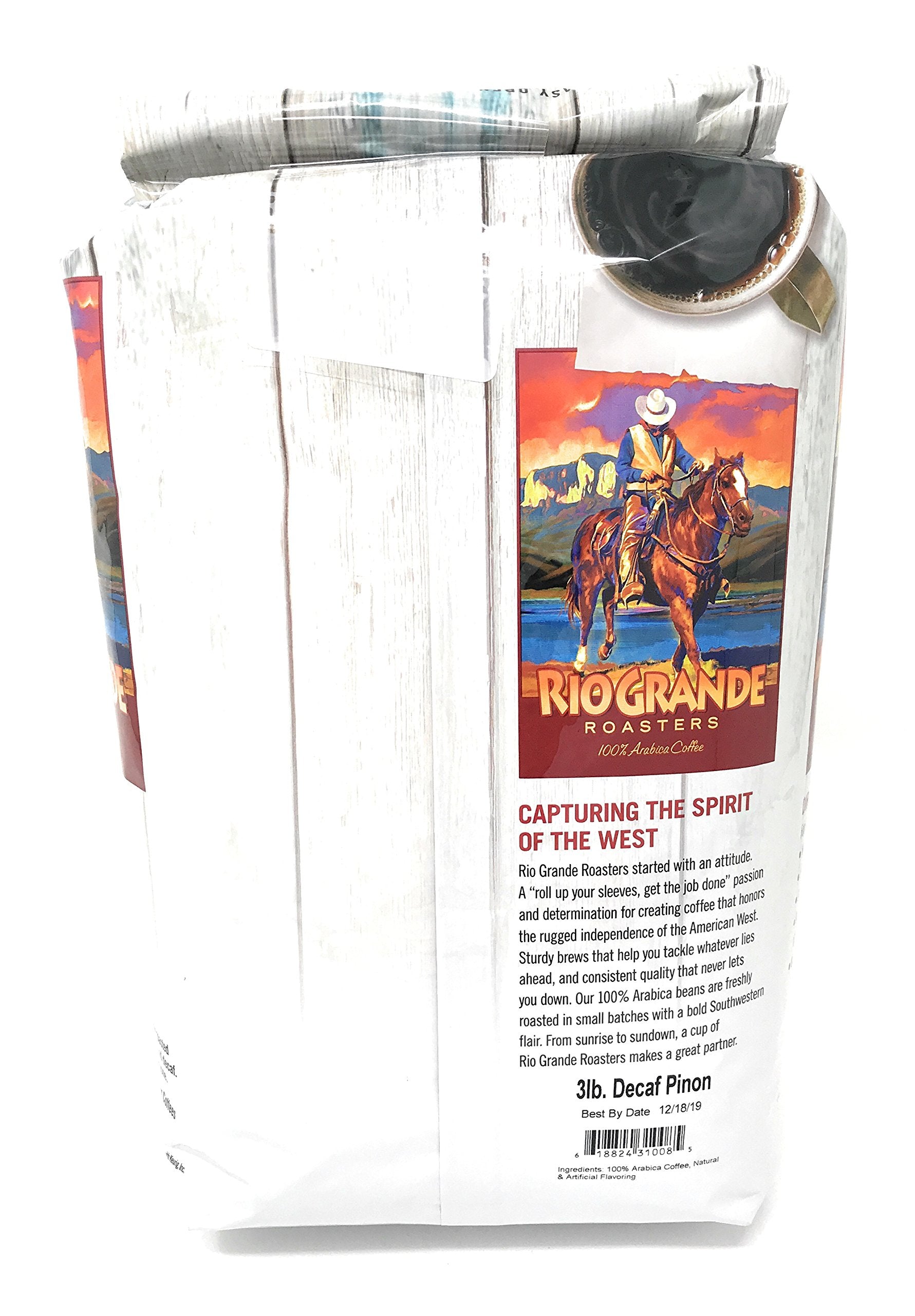 Over 65 years of Coffee Sourcing and Roasting ExperienceCelebrating the Spirit of the West, Rio Grande Roasters started with an attitude. A “roll up your sleeves, get the job done” passion and determination for creating coffee that honors the rugged independence of the American West. Sturdy brews that help you tackle whatever lies ahead, and consistent quality that never lets you down. FLAVOR PROFILECreating a unique coffee experience with rich flavors of the American West. A blend of the best Arabica coffee and pinon nutsRio Grande Decaf Pinion Coffee - Medium roast whole bean coffee is made with high quality 100% Arabica beans, expertly roasted and immediately packed for freshness. Each brew leaves you with a subtle smooth taste of the fine roasted nuts and the nutty pinon. Hello, refill.