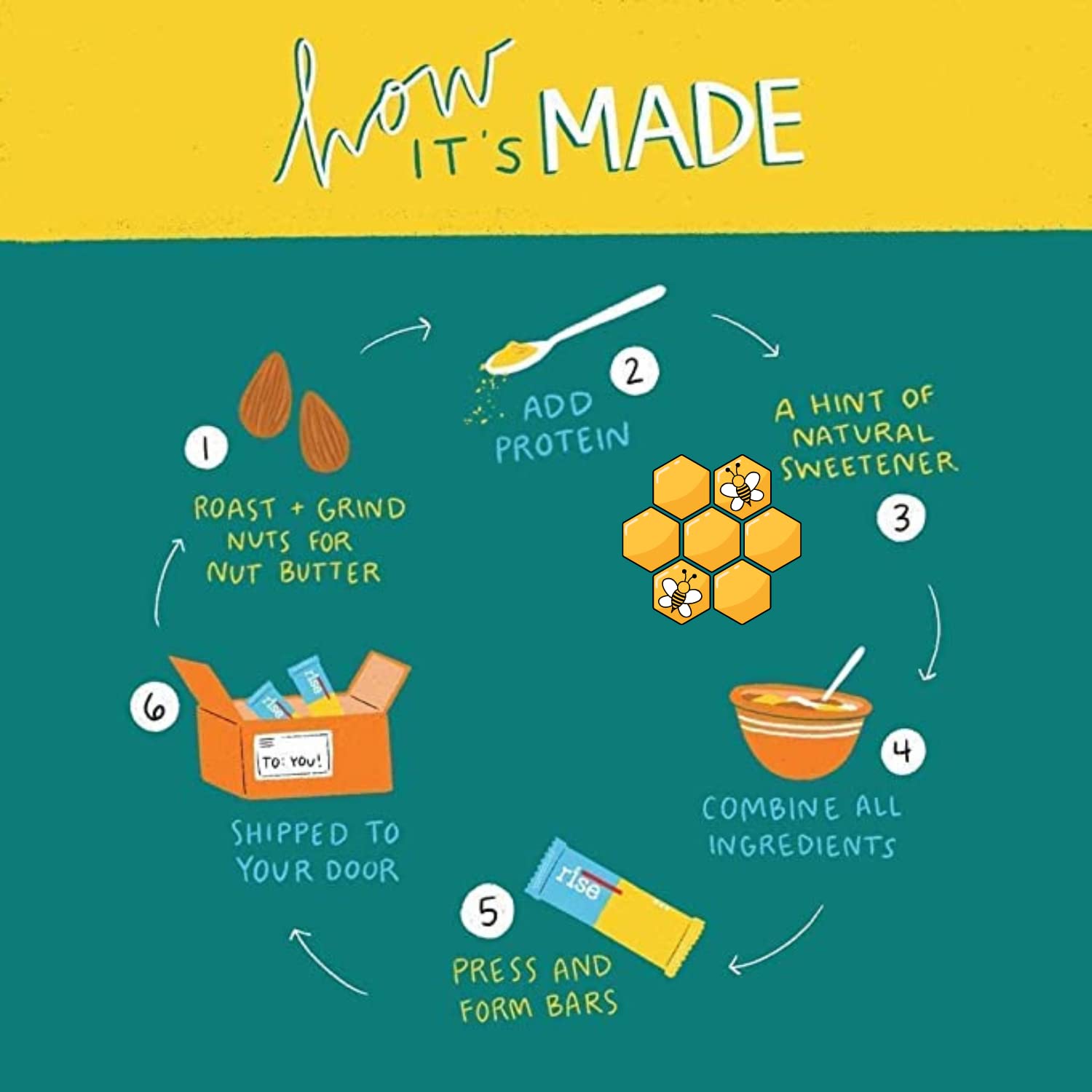 We believe life is complicated enough. Our quest with each Rise Bar is that it is made with only the essential ingredients needed to fuel your busy life. Packed with 20 grams of protein, its perfect for breakfast, snacks, pre-workout, post-workout or as a meal replacement. Weve got one of the shortest ingredient lists youve ever seen: 3 ingredients are all we need to make the Rise Almond Honey bar the simplest, most energizing protein bar that never compromises on taste. Every Rise Protein Bar provides slight, delicious variations in each of our health snacks. Were totally non-GMO project verified, soy free, peanut free, grain and gluten free, and we never use artificial sugars, preservatives or sugar alcohols. Paleo friendly. Best nutrition for human health. The only sugar in this bar is derived naturally from honey (13g), but we do recommend consulting with a dietician to find the correct amount of sweetener for your diet. Whether you are on a paleo diet, vegan, celiac, or vegetarian - Rise Bar has something to fit your needs. Rise Bars work best for a diet that is focused on whole ingredients and high protein. There are no artificial sweeteners added, like stevia. Now, theres no need for buying giant quantities of bulk vanilla powder from the grocery store for your smoothies. Move faster in the morning with our quick and convenient box full of premier quality bars. The taste is delicious and better than ever, and doesnt taste bland or like chalk. Become a fan of our bars, no matter what your lifestyle! Ingredients: Honey, Almonds, Whey Protein Isolate (dairy) With 8 delicious assorted flavors and 5 ingredients or less, each Rise Bar has the nutrition you need without all the extra stuff. All eight of our satisfying flavors are mixed by hand in our very own kitchen. This means each batch is a little different, which makes every bite you take a unique flavor experience. Check out our storefront for more great flavors from Rise!