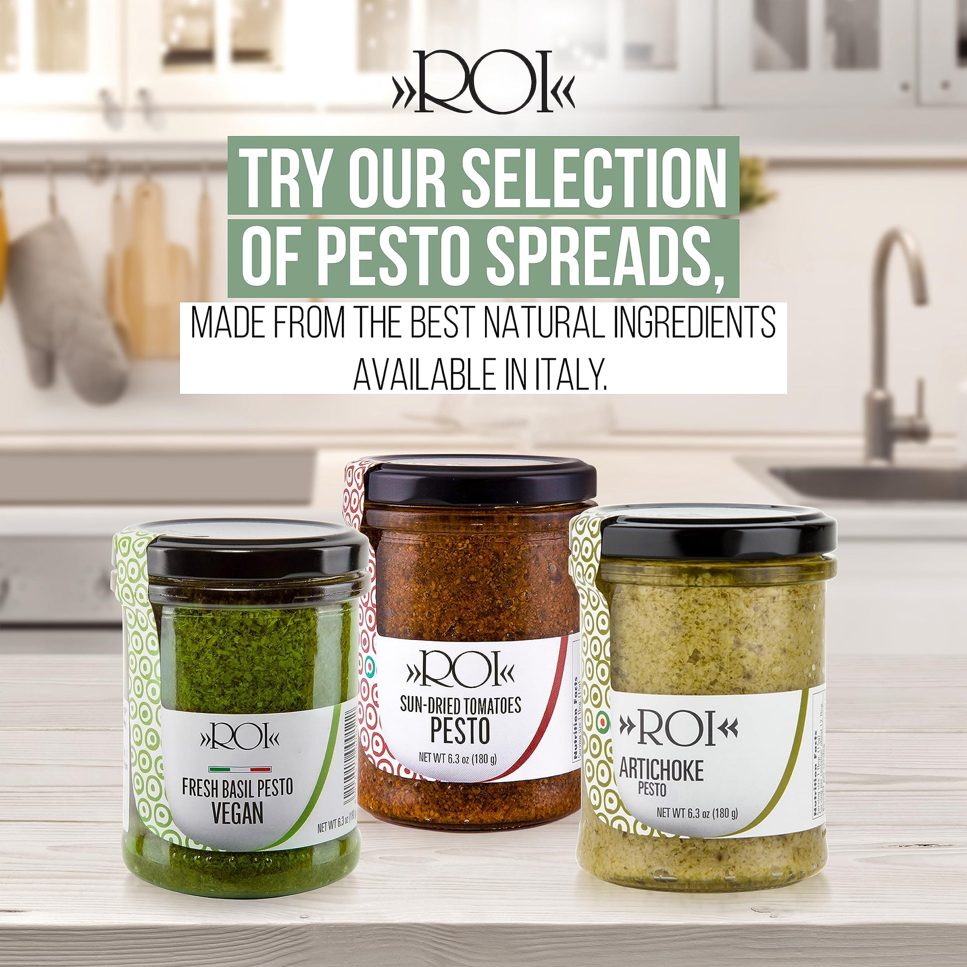 Red Pesto An update on the classic basil pesto, our Red Pesto is created after selecting the best ingredients. Made with sundried tomatoes, cashew nuts, basil, garlic, and parmesan cheese in Roi extra virgin olive oil, this represents an authentic Ligurian pesto taste that you can enjoy anytime. Versatile Our Sundried Tomato Pesto can be used to make many different recipes, or as a condiment to your food. While pesto is traditionally used as a pasta sauce, it can be added to soup and many other dishes to add extra flavor. Pesto is a kitchen staple and the perfect addition to your Italian cooking at home. Pure Ingredients Extra virgin olive oil 51%, sundried tomatoes 27%, cashew nuts, Basilico Genovese DOP concentrated* 7%, salt, vinegar, garlic, Parmesan cheese (milk, salt, rennet), Acidulants: lactic acid, citric acid. *deprived of water. Frantoio Roi Roi is a small family-owned EVOO producer that has been operating for four generations and is focused on quality. The Frantoio Roi, also known as the olive mill, is currently composed of the traditional mill with a granite millstone and two presses, as well as a newly designed mill with a continuous cycle and cold extraction. Italian Olives The estate is located in one of the most unique corners of Italy. Olive trees grow on terraced land in very steep hills and cliffs overlooking the Mediterranean Sea. The climate and sea influence the oil's wonderful taste and unique aroma.