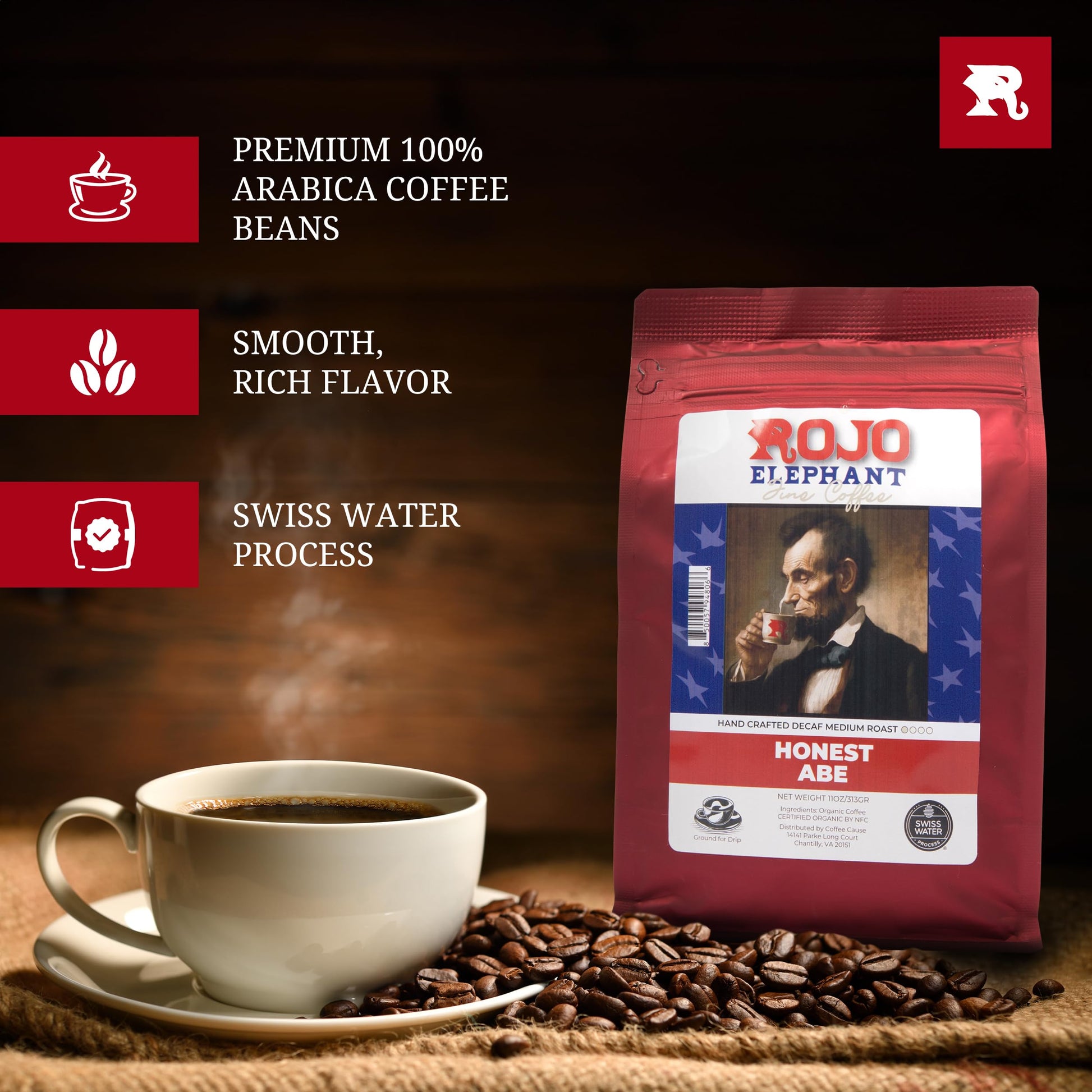 - Q: What makes Rojo Elephant Honest Abe decaf coffee unique? A: Rojo Elephant Honest Abe decaf coffee is unique because it is handcrafted using premium 100% Arabica beans sourced from a high-elevation family farm in Nicaragua. The beans undergo a meticulous Swiss Water Process to ensure a clean, rich flavor without bitterness.