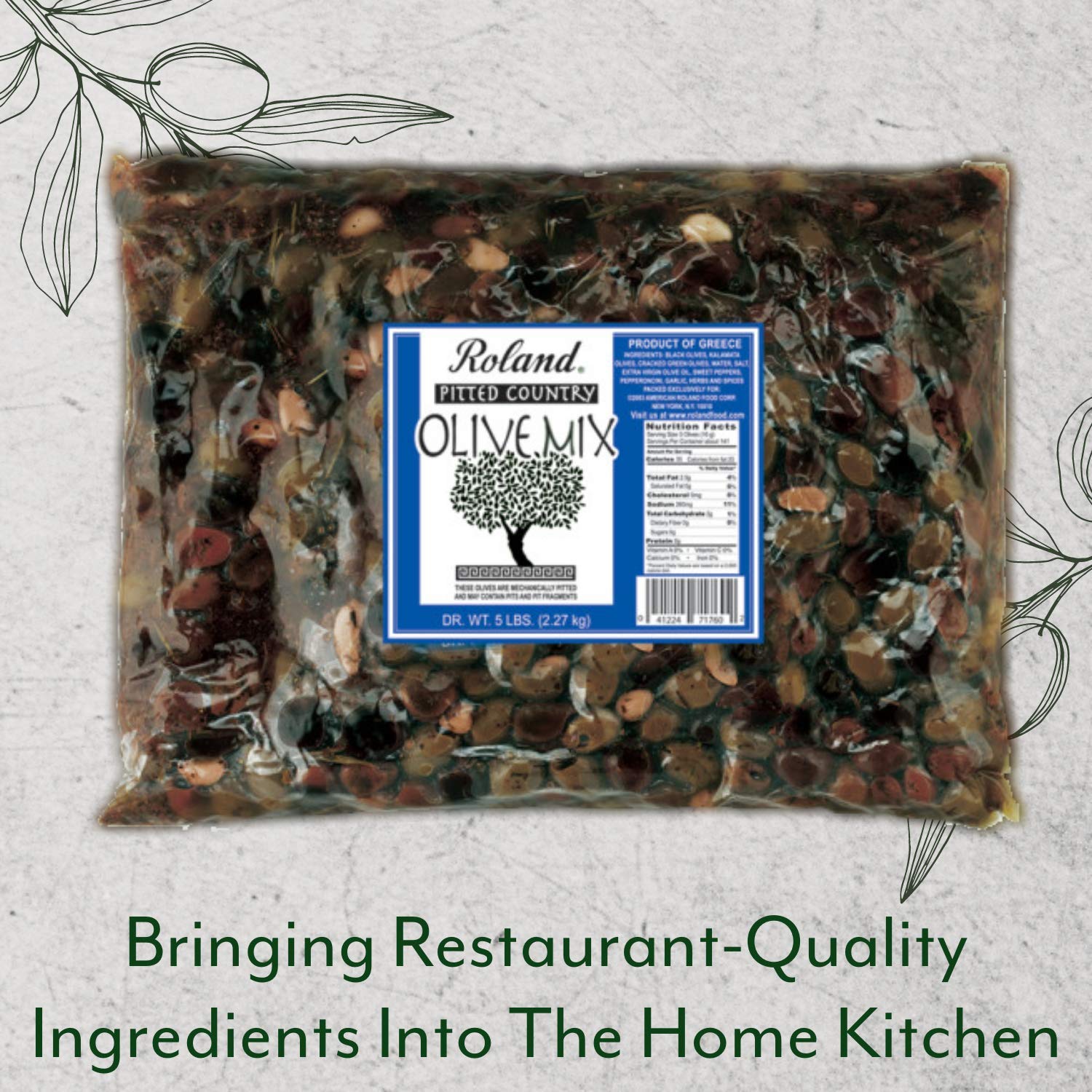 Roland Foods Greek Country Olive Mix, Whole Pitted Olives Marinated With Garlic And Pepperoncini Peppers, Specialty Imported Food, 5 Pound Bag, Pack Of 1