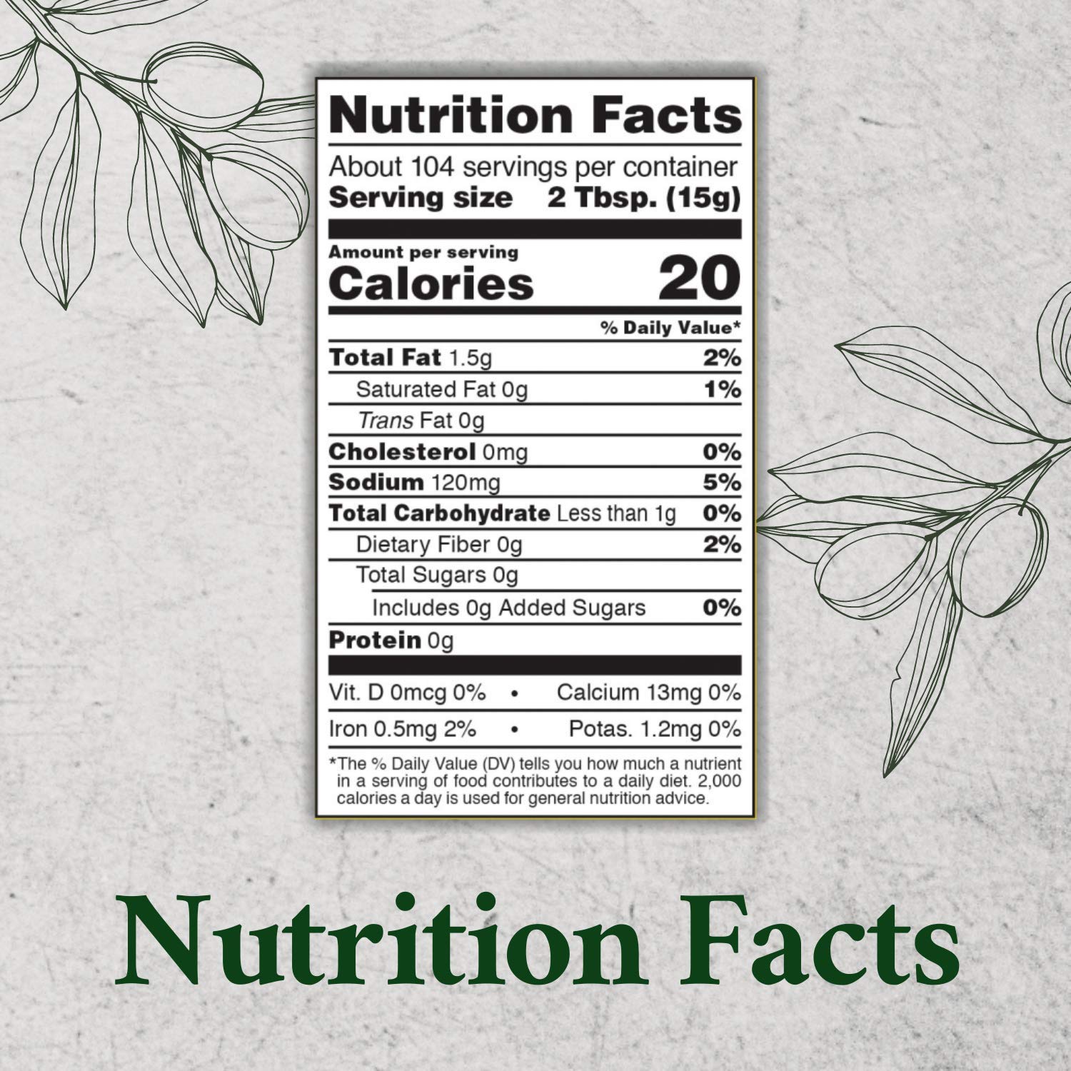 Q: What is the size of the can and how many servings does it provide?A: The olives are packaged in a 55-ounce bulk can, which is great for food service applications and can provide multiple servings for home use, perfect for gatherings or meal prep.
