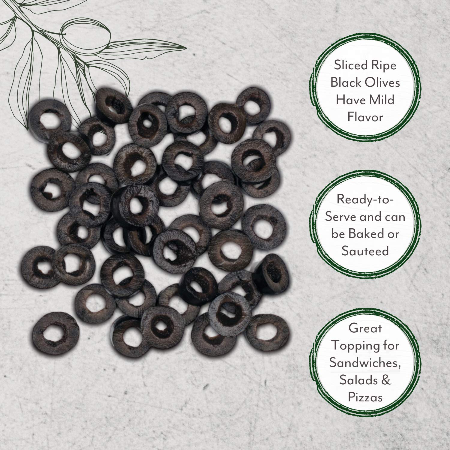 Q: What is the texture and flavor profile of these black olives?A: Roland Foods Sliced Black Ripe Olives have a savory and mild taste with a medium-firm texture, making them enjoyable whether eaten raw, baked, or sautéed.