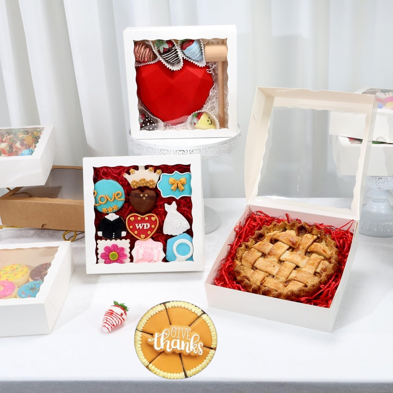 - Q: Are the bakery boxes suitable for all types of baked goods? A: Yes, these bakery boxes are designed to hold a variety of treats, including chocolate covered strawberries, cookies, macarons, truffles, and mini cakes.