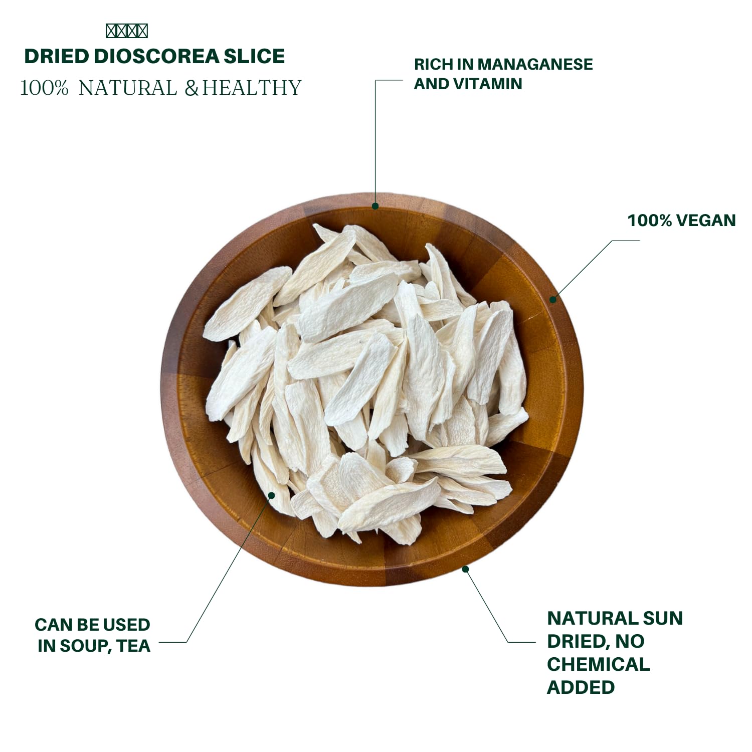 - Q: How can I incorporate dried Dioscorea slices into my diet? A: You can incorporate dried Dioscorea slices into your diet by adding them to soups, stews, or stir-fries. They can also be soaked in water to soften before consumption or ground into a powder for use in smoothies and health shakes.
