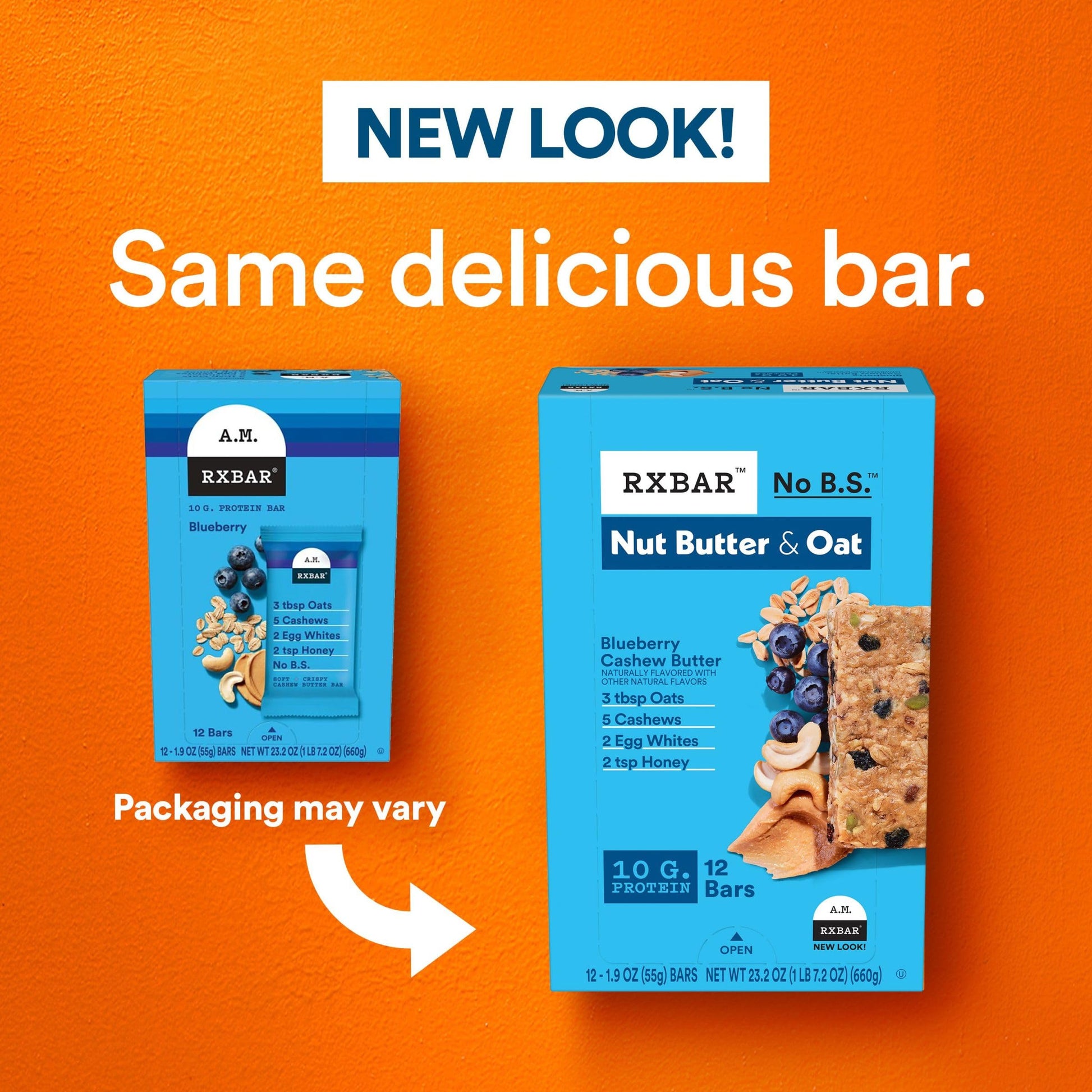 Q: What are the main ingredients in RXBAR Nut Butter and Oat Protein Bars?A: RXBAR Nut Butter and Oat Protein Bars are made with simple, recognizable ingredients including soft-rolled oats, cashews, egg whites, honey, and blueberries, ensuring a wholesome snack choice.