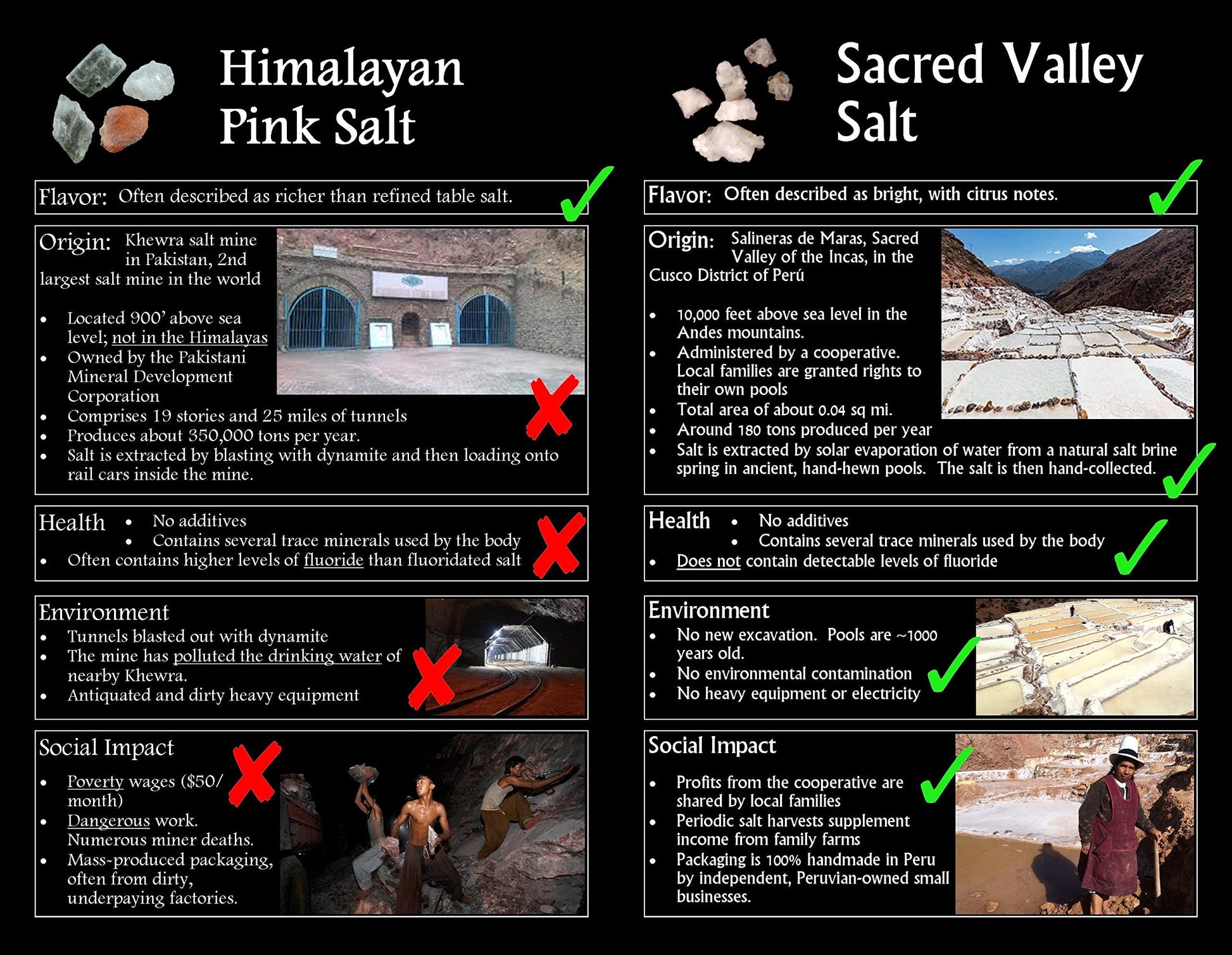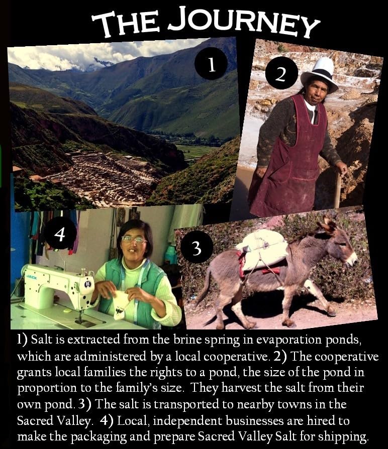 Sacred Valley Salts unique flavor comes from the combination of trace minerals present in the salt spring from which it is obtained. High in the Peruvian Andes, the salt is extracted just like it has been for the past several centuries - through solar evaporation using ponds that predate the Inca civilization. Its superior flavor and generous moisture content make for an ideal finishing salt. Use with a grinder of your choice to achieve the desire grain size. Sacred Valley Salt quite likely has a smaller environmental impact than that of any other salt. Just as in the past, all aspects of production are performed by hand - no heavy equipment, no factory, no slag heaps, no waste. Sales of Sacred Valley Salt directly and concretely benefit the local inhabitants of the Sacred Valley. Sacred Valley Salt Co.s business practices surpass the Fair Trade model by ensuring that a much larger portion of the proceeds actually reach local producers themselves. Furthermore, rather than simply hiring locals as laborers, Sacred Valley Salt Co. helps locals to invest in themselves. Partnerships are established on equal footing with independent, locally-owned cooperatives and small businesses. Good Salt. 100% Responsible. 0% Hype.
