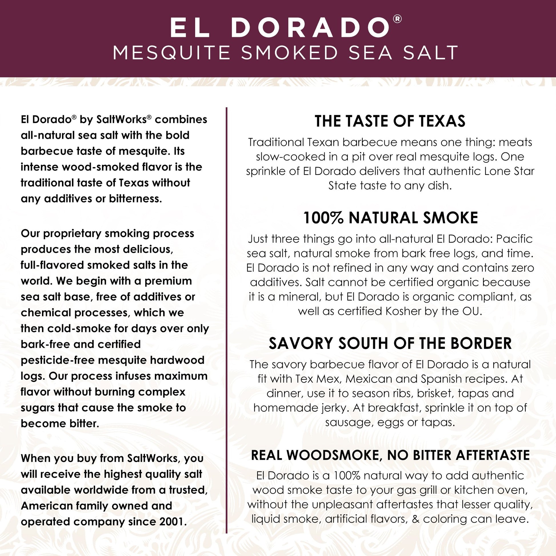 - Q: What cuisines pair well with El Dorado Mesquite Smoked Sea Salt? A: This gourmet salt is particularly effective with traditional Texas BBQ, Mexican, Tex-Mex, and Spanish cuisines, elevating the flavors of various dishes across these culinary styles.