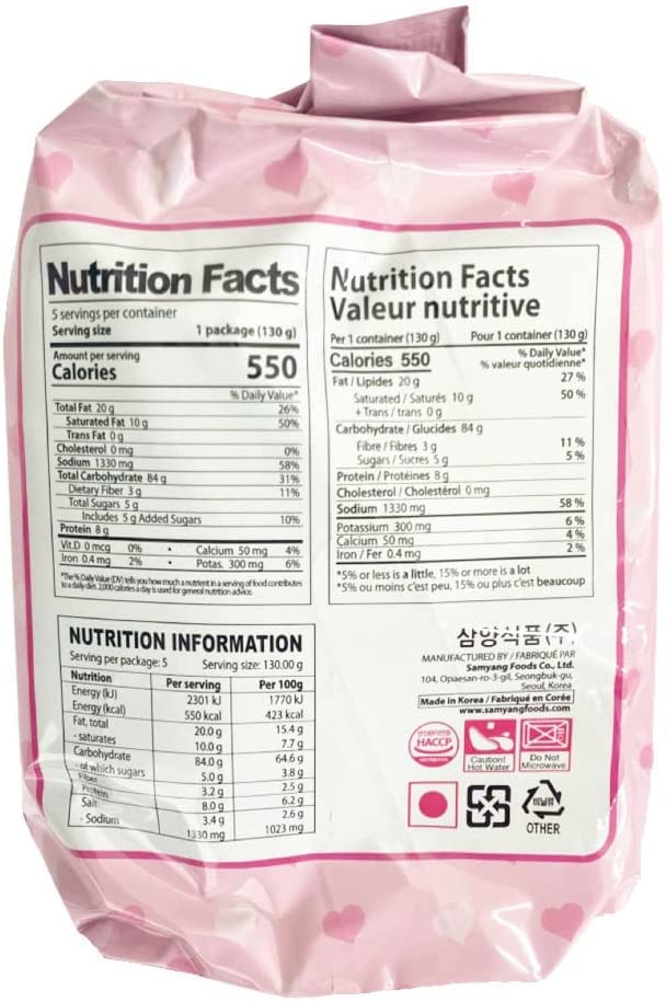 Recipe 1 Add 600 ml of boiling water and boil for about 5 minutes 2 Leave 8 tablespoons of water, please put in liquid soup and powdered soup Nutrient calorie 550kcal carbohydrate 84g 5 g of saccharides 8 g protein Fat 20g Saturated fat 10g Trans fat 0g cholesterol 0mg Sodium 1330 mg