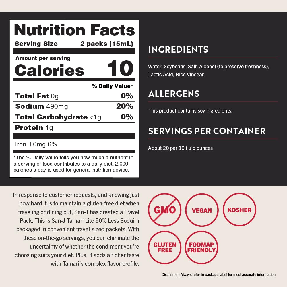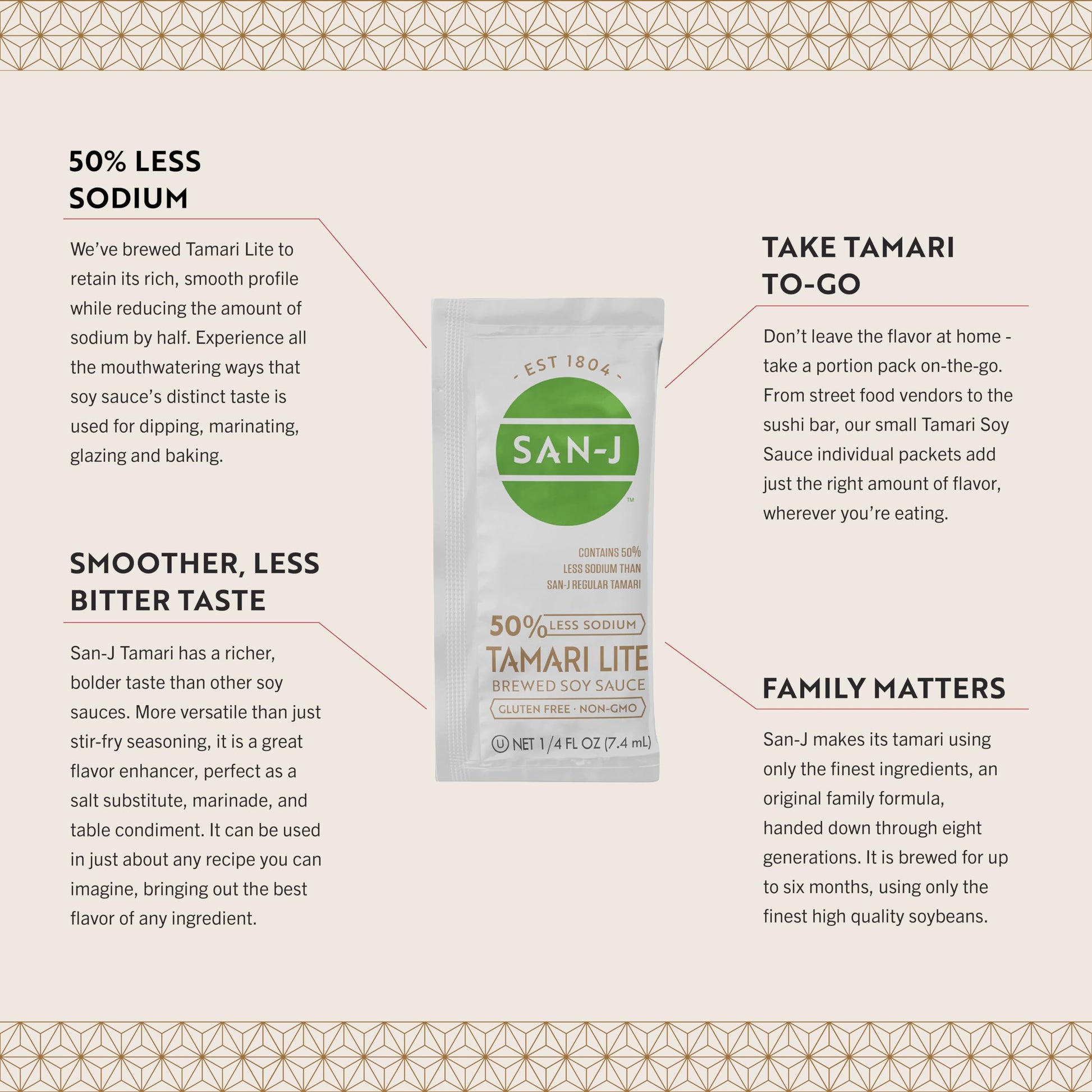 San-J - Gluten Free Tamari Lite Soy Sauce with 50% Less Sodium - Made with 100% Soy - Specially Brewed - 1/4 oz. Individual Port