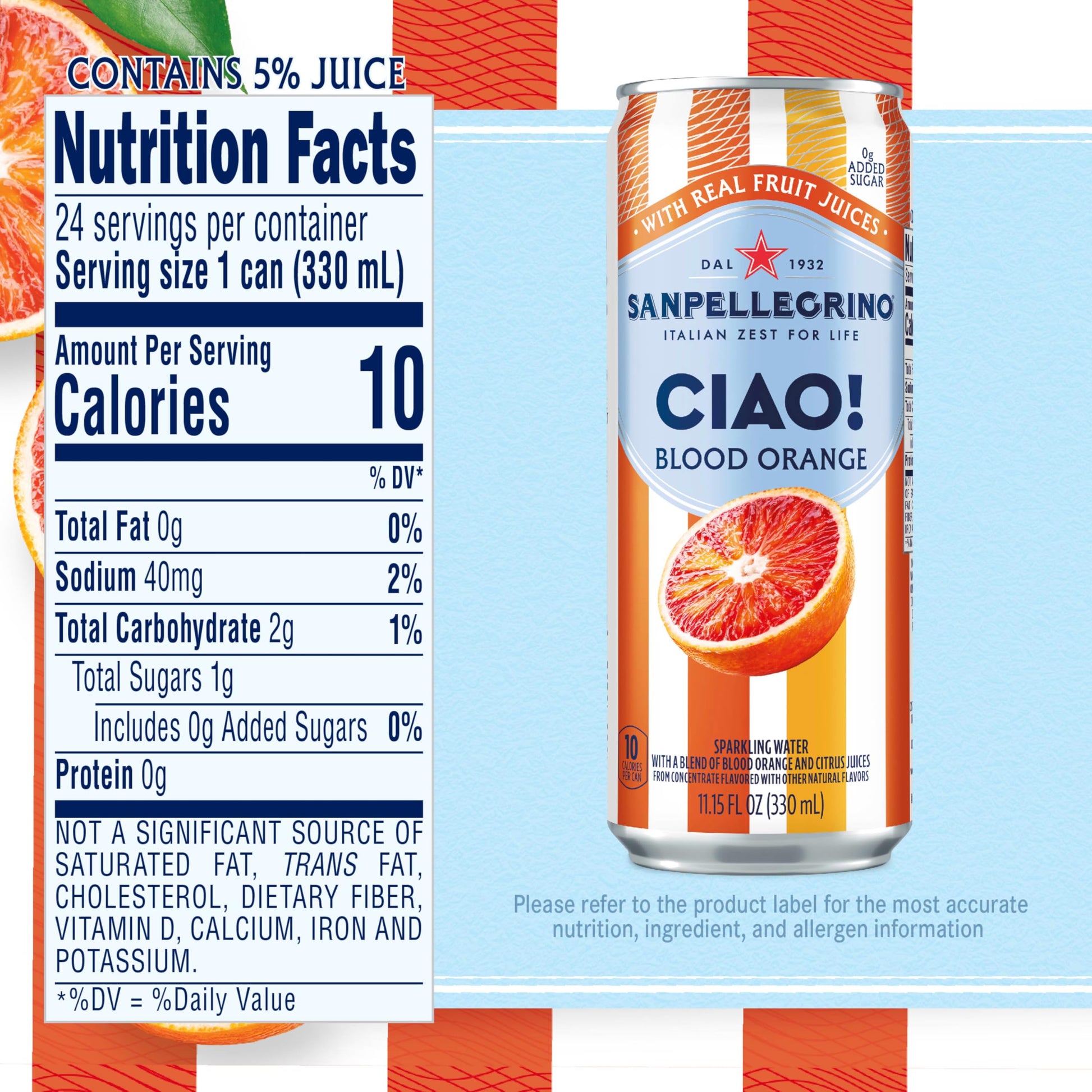 - Q: What makes Sanpellegrino CIAO Blood Orange Sparkling Water unique? A: Sanpellegrino CIAO Blood Orange Sparkling Water is unique due to its blend of real fruit juices, natural flavors, and a hint of Sicilian salt, creating a refreshing beverage that captures the essence of Italy. With only 10 calories and 0g added sugar, it's a low-calorie option for those seeking flavorful hydration.