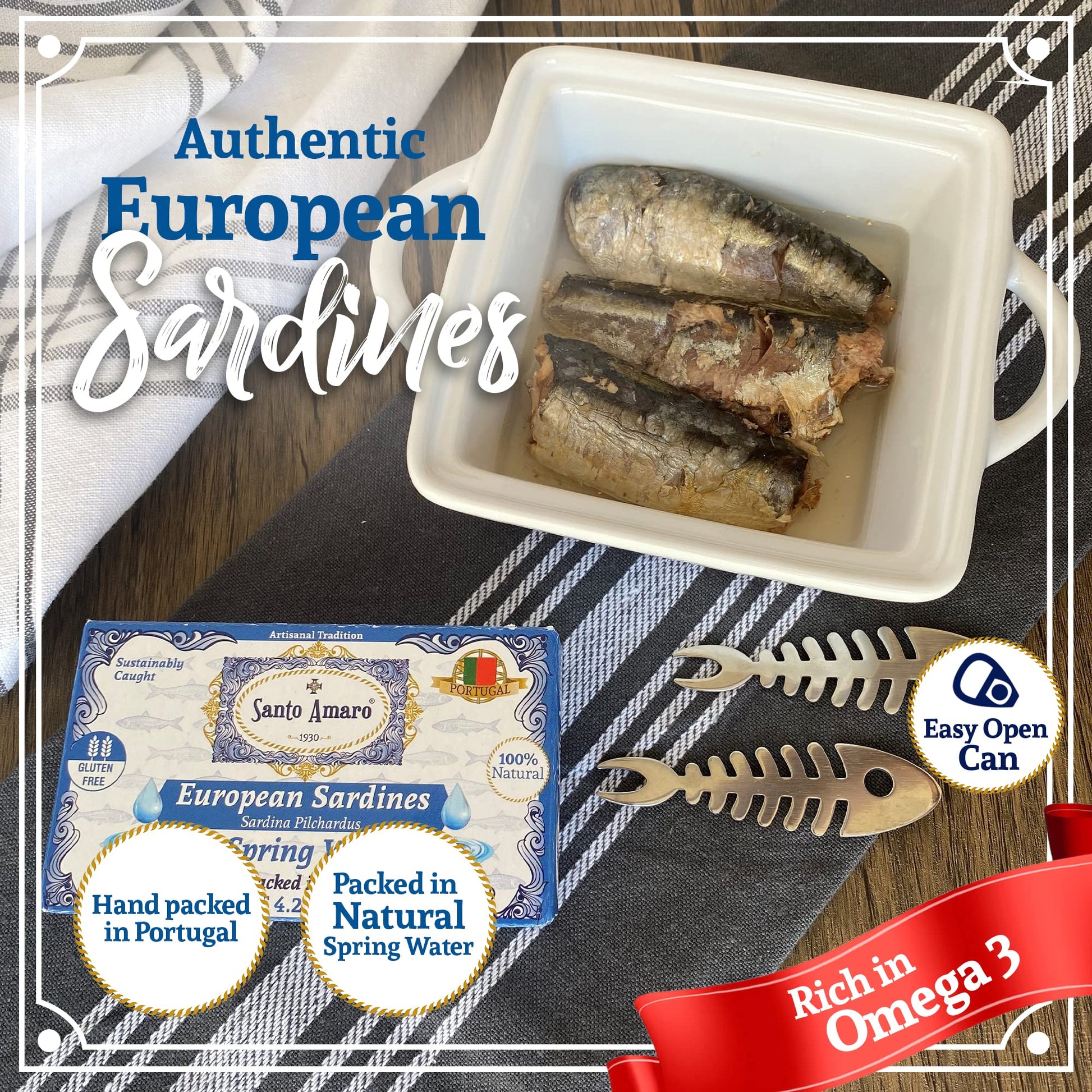 Artisanal Tradition - Always Authentic and Fantastic Tasting! - Hand Packed in PORTUGAL QUALITY INGREDIENTS: Sustainably Wild Caught (Atlantic Ocean) European Sardines (Sardina Pilchardus), Spring Water, and Sea Salt 100% NATURAL: Gluten Free, GMO Free, BPA Free Cans SUPERFOOD: Protein, Omega 3, Calcium, and more AUTHENTIC: Processed in the traditional Portuguese artisanal method; quality sardines are selected then flash seared, locking in freshness, then they are hand-packed into Easy Open Cans (4.23 Oz - 120g Each) DIETS: Keto, Paleo, Whole30, Mediterranean, Dash, Kosher, Ayurvedic, and Flexitarian. Bom Proveito!