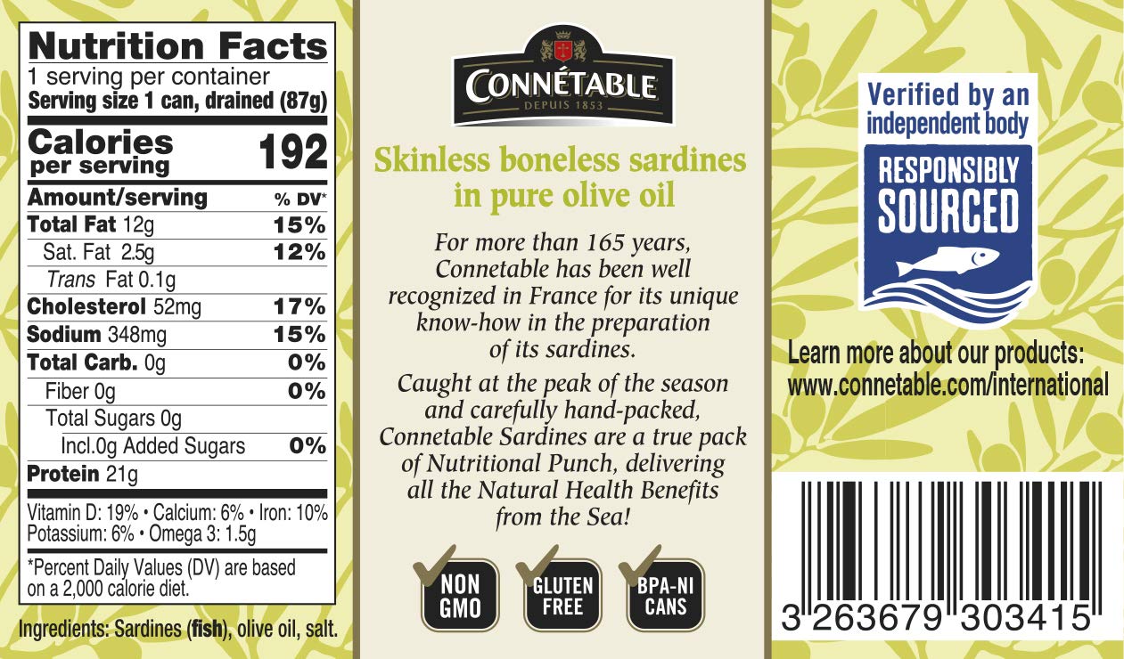 Q: Are Connetable sardines gluten-free and non-GMO?A: Yes, Connetable sardines are gluten-free and certified non-GMO. They are packaged in BPA-free cans, ensuring that you enjoy a safe and healthy product.