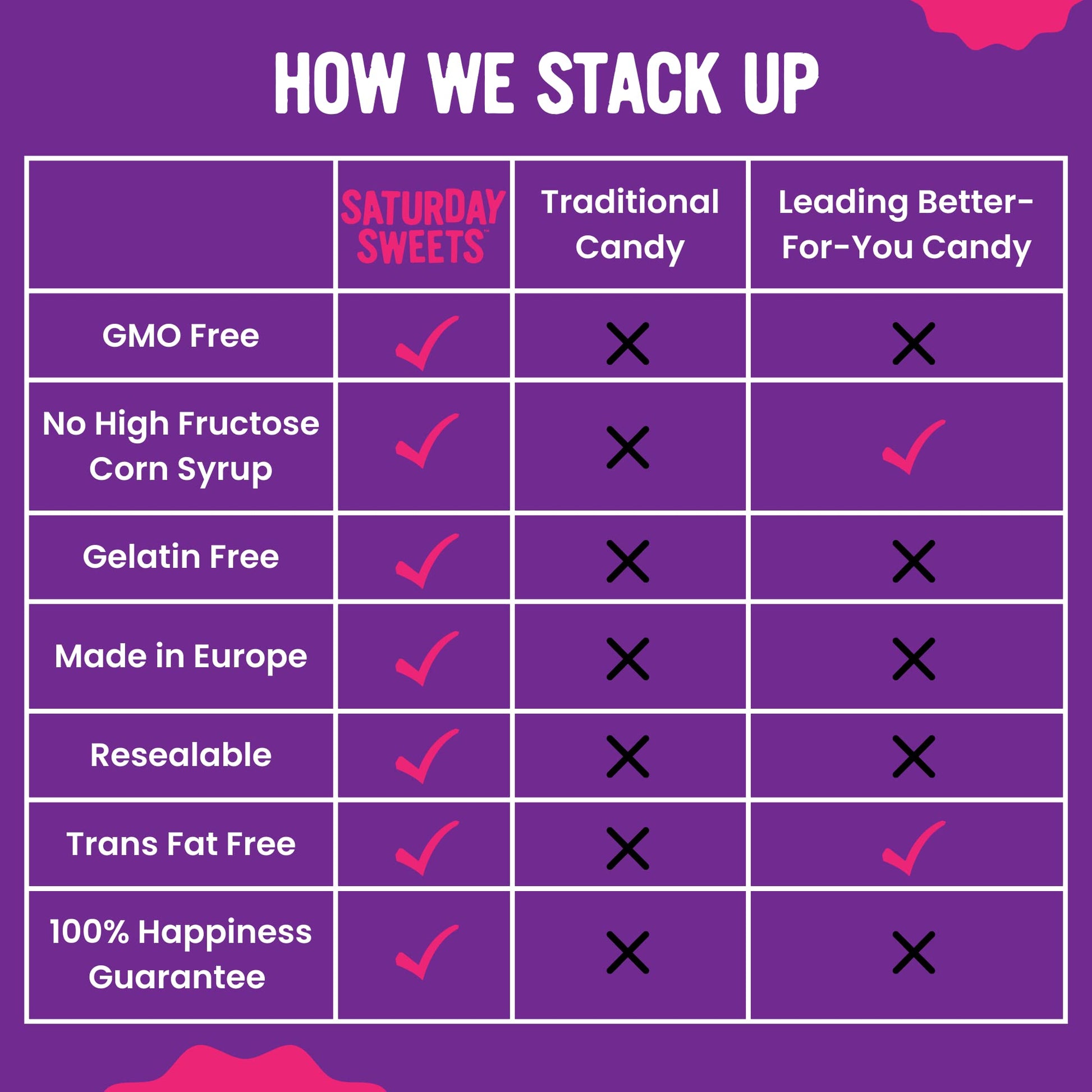 Q: What makes Saturday Sweets Mini Dummies a healthier candy option?A: These candies are made from non-GMO ingredients, are gelatin-free, and do not contain high fructose corn syrup, making them a better-for-you choice for candy lovers.