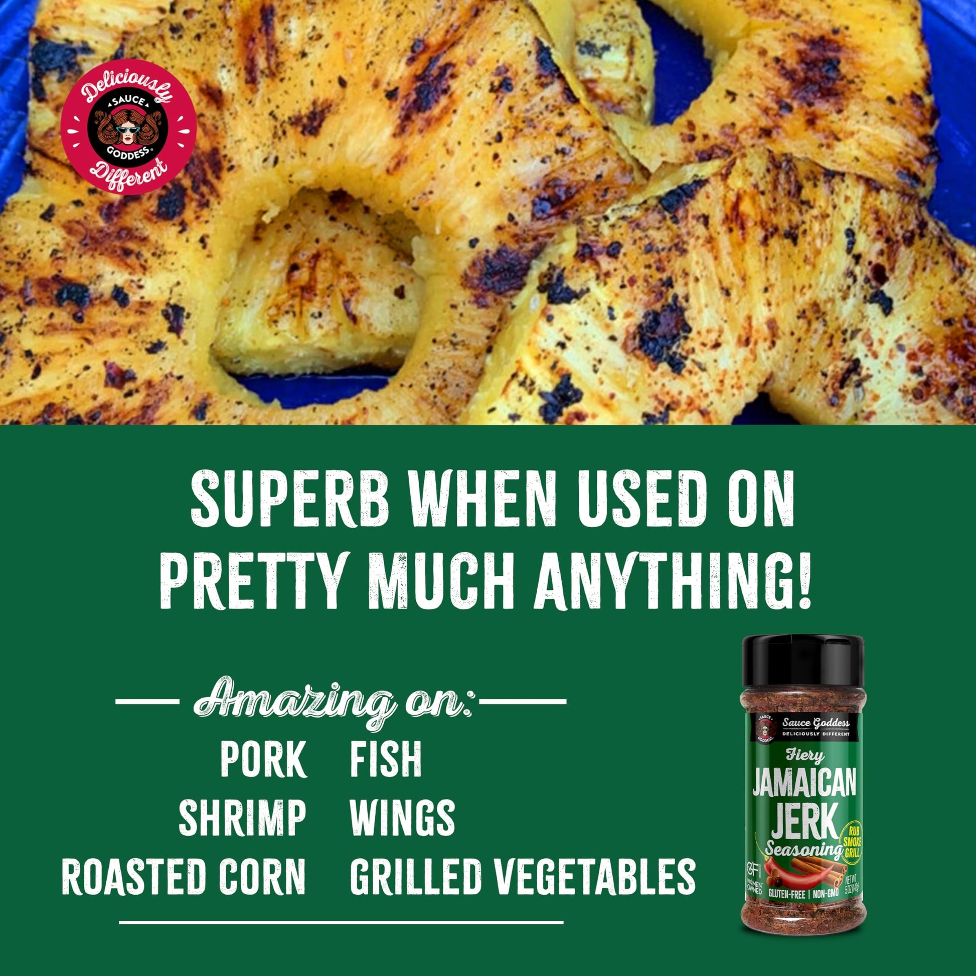 - Q: What dishes can I use Sauce Goddess Fiery Jamaican Jerk Spice on? A: This versatile spice blend is perfect for a variety of dishes, including chicken, pork, fish, shrimp, grilled vegetables, and even pineapple. It enhances the flavors and adds a spicy kick to any meal.