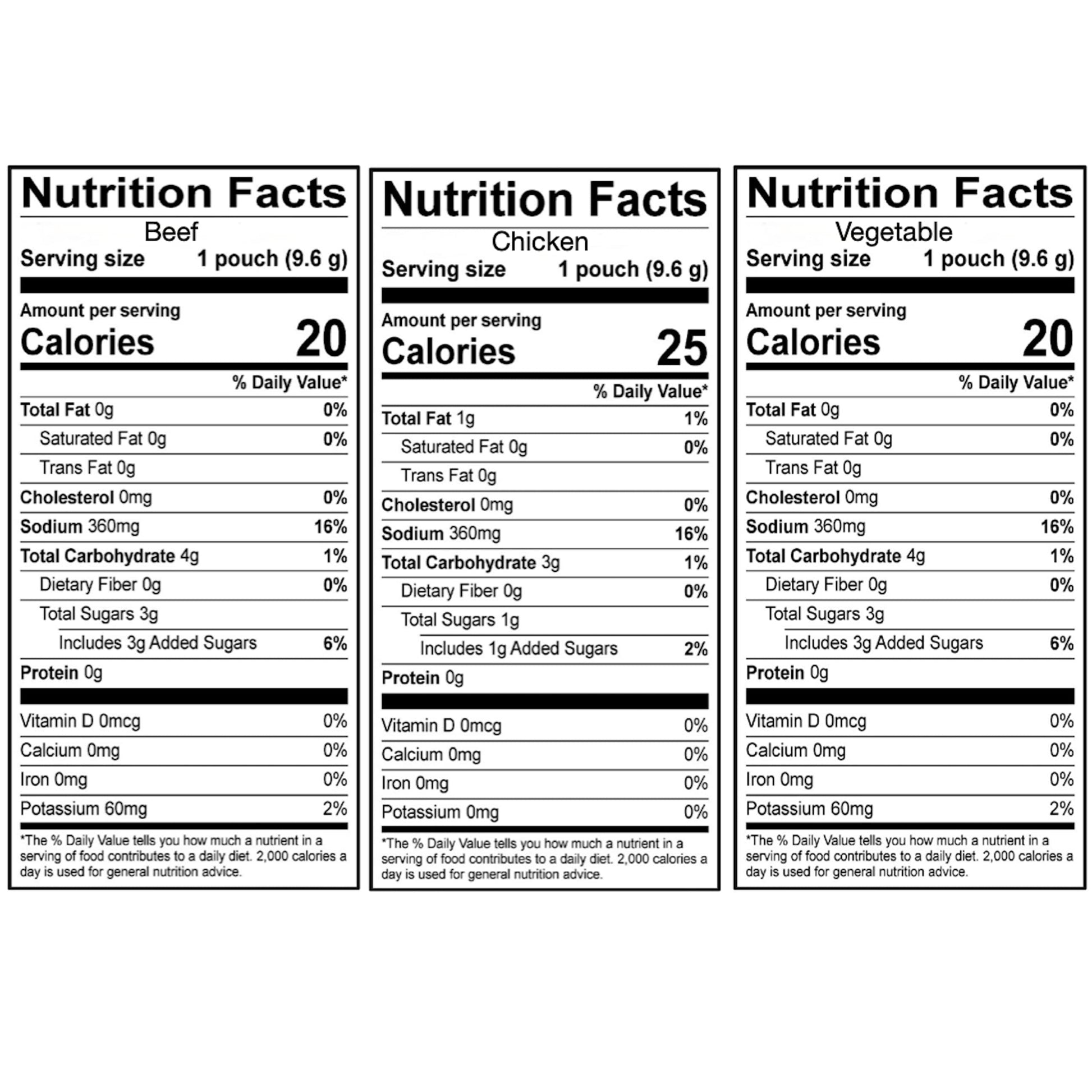 Q: What flavors are included in the variety pack?A: The Savory Choice Broths Variety Pack includes three delicious flavors: Beef, Chicken, and Vegetable. Each flavor comes in convenient packets, making it easy to switch between them.