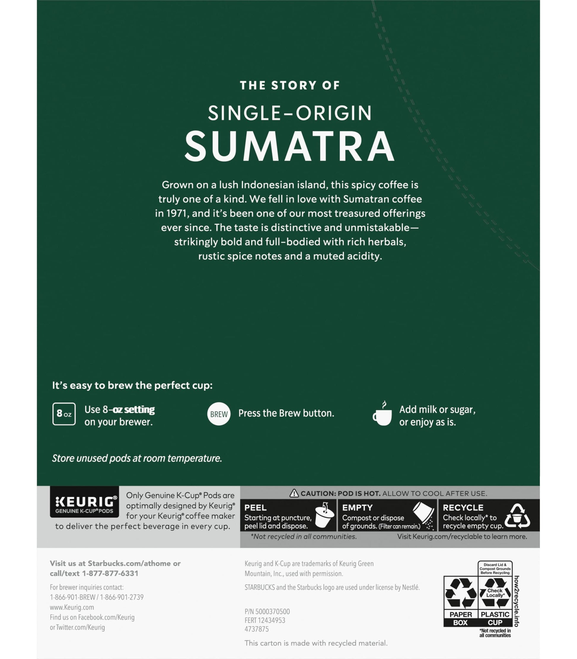 Q: What is the flavor profile of Starbucks Sumatra K-Cup?A: Starbucks Sumatra K-Cup offers a rich, full-bodied coffee experience with earthy and herbal notes. It is known for its bold flavor and low acidity, making it a favorite among dark roast coffee lovers.