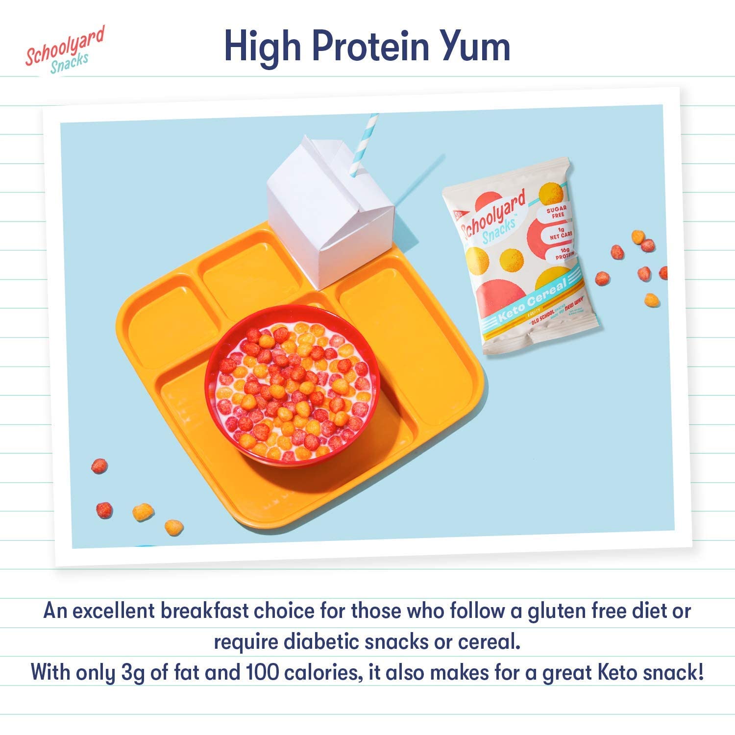 - Q: How much protein and carbs are in each serving of the Keto Cereal? A: Each 26g pouch of Schoolyard Snacks Keto Cereal contains 16g of protein and only 1g of net carbs. This makes it an excellent choice for anyone looking to maintain a low-carb lifestyle while enjoying a delicious breakfast or snack.