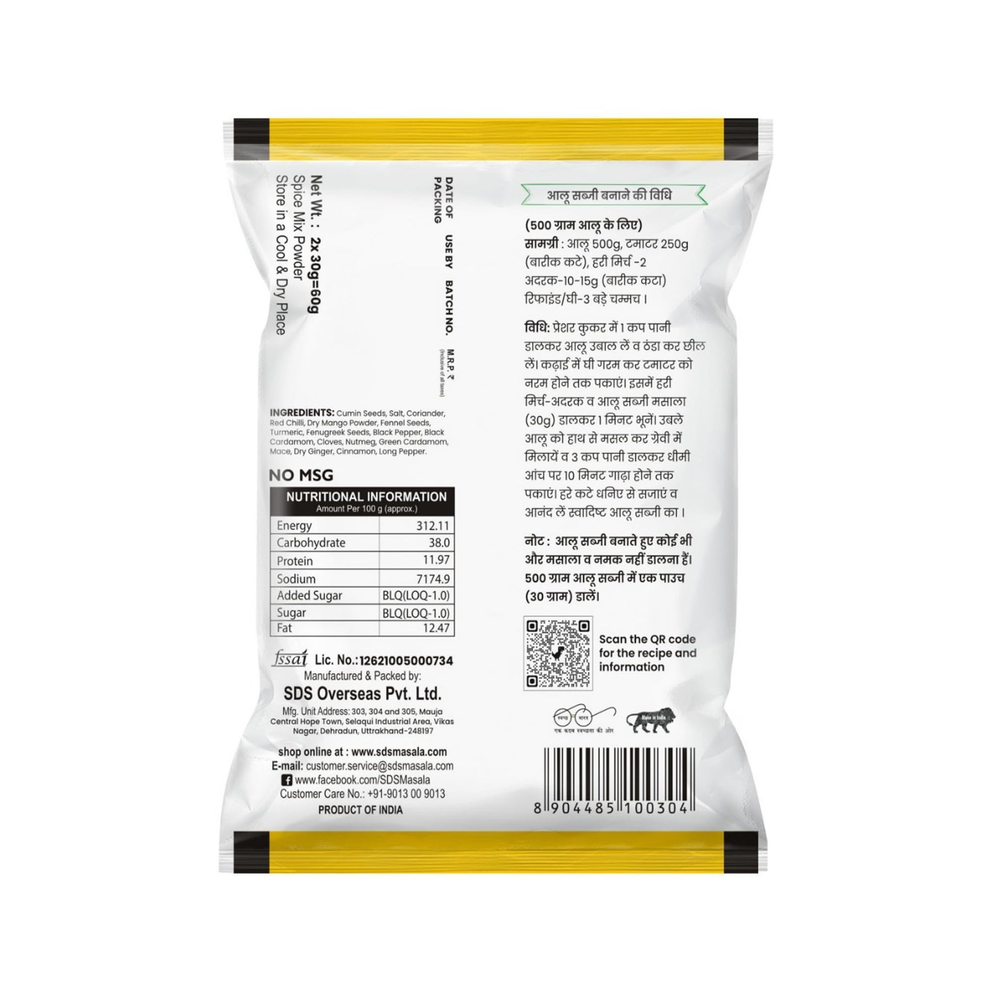 Q: Is there any salt or additional masala in SDS Aloo Sabji Masala?A: No, SDS Aloo Sabji Masala does not contain any salt or additional masala, allowing you to control the seasoning according to your taste preferences.