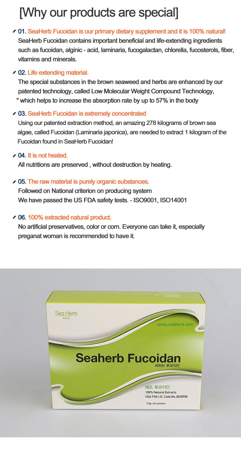 - Q: What makes SeaHerb Fucoidan different from other seaweed supplements? A: SeaHerb Fucoidan stands out due to its patented Low Molecular Weight Compound Technology, which enhances nutrient absorption by up to fifty-seven percent compared to standard seaweed supplements. This technology maximizes the efficacy of the beneficial compounds present in the brown sea algae.