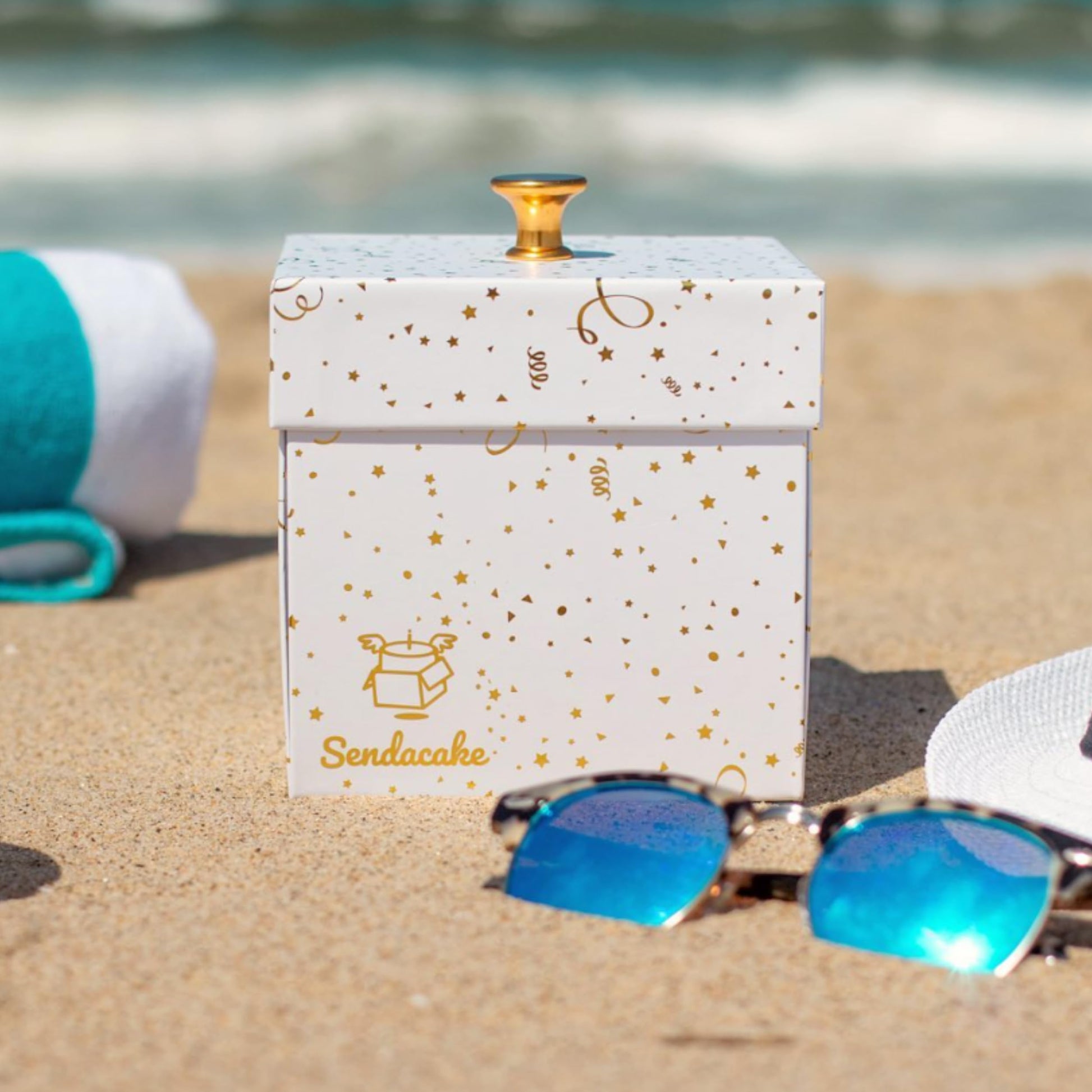 Q: What is included in the SendaCake Celebration Explosion Gift Box?A: The SendaCake Celebration Explosion Gift Box includes a scrumptious 3" chocolate chip mini bundt cake topped with sprinkles, beautifully packaged in a premium white box adorned with gold-foiled confetti, flying butterflies, and faux roses.