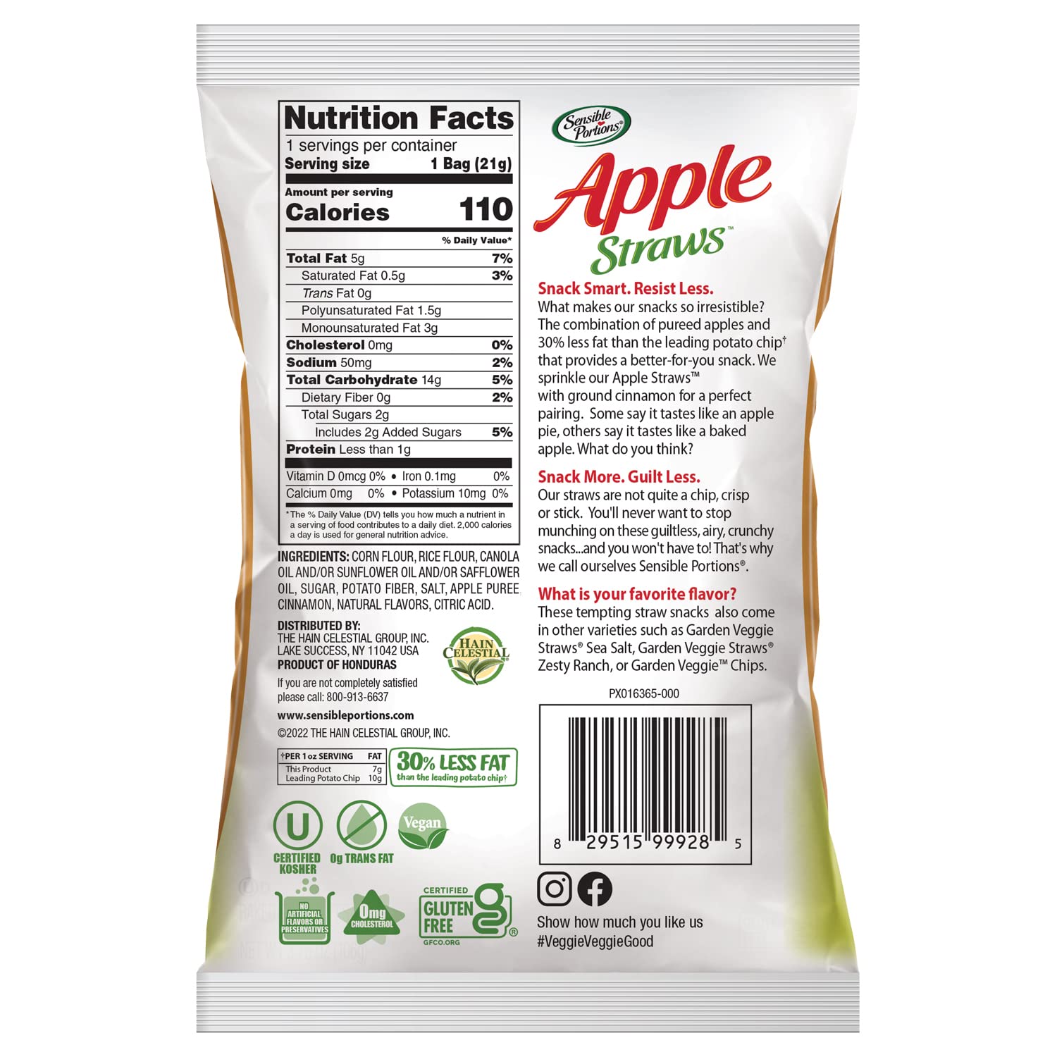 Sensible Portions Garden Veggie Straws Have The Crispy Crunch And Taste-Bud-Tantalizing Flavor You Want In A Snack, But Without All Of The Artificial Flavors And Artificial Preservatives That You Don'T. Our Veggie Straws Are Made With Potatoes And Vegetables Grown In A Sun-Splashed Garden, For A Veggie-Full Snack That Has 30% Less Fat Than The Leading Brand Of Potato Chips. At Sensible Portions Brand, We Believe You Shouldnt Have To Compromise On Taste When Choosing A Better-For-You Snack. Thats Why Each Of Our Products Are Made With Delicious, Wholesome Ingredients That Pack Fun And Flavor, Not Artificial Preservatives, Fillers Or Artificial Flavors. Its Also Why We Continue To Expand Our Portfolio To Offer You And Your Family A Variety Of Snacking Choices That Include Non-Gmo, Gluten-Free, Vegan And Organic Options. Great For Eating On-The-Go Or In-Between Meals, We Offer Something To Keep Everyone In Your Family Happy And Satisfied. Our Veggie Straws Contain 7G Fat Per Serving Compared To The Leading Potato Chip Brand At 10G Of Fat Per Serving.