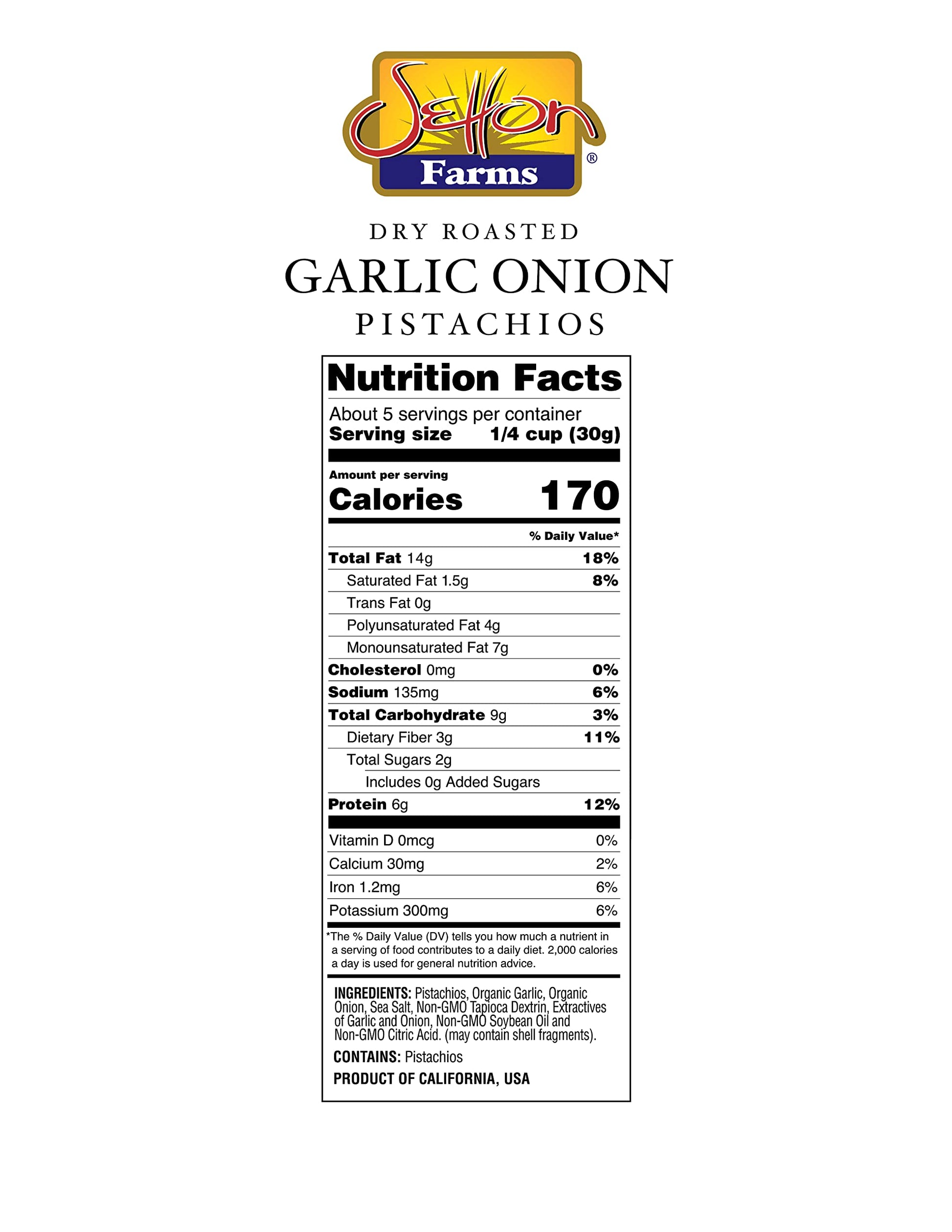 Q: What are Setton Farms Naturally Seasoned Pistachio Kernels made of?A: Setton Farms Naturally Seasoned Pistachio Kernels are made from premium California pistachios that are dry roasted and seasoned with a savory blend of garlic and onion. They contain no artificial colors, flavors, or preservatives, making them a natural and healthy snack option.