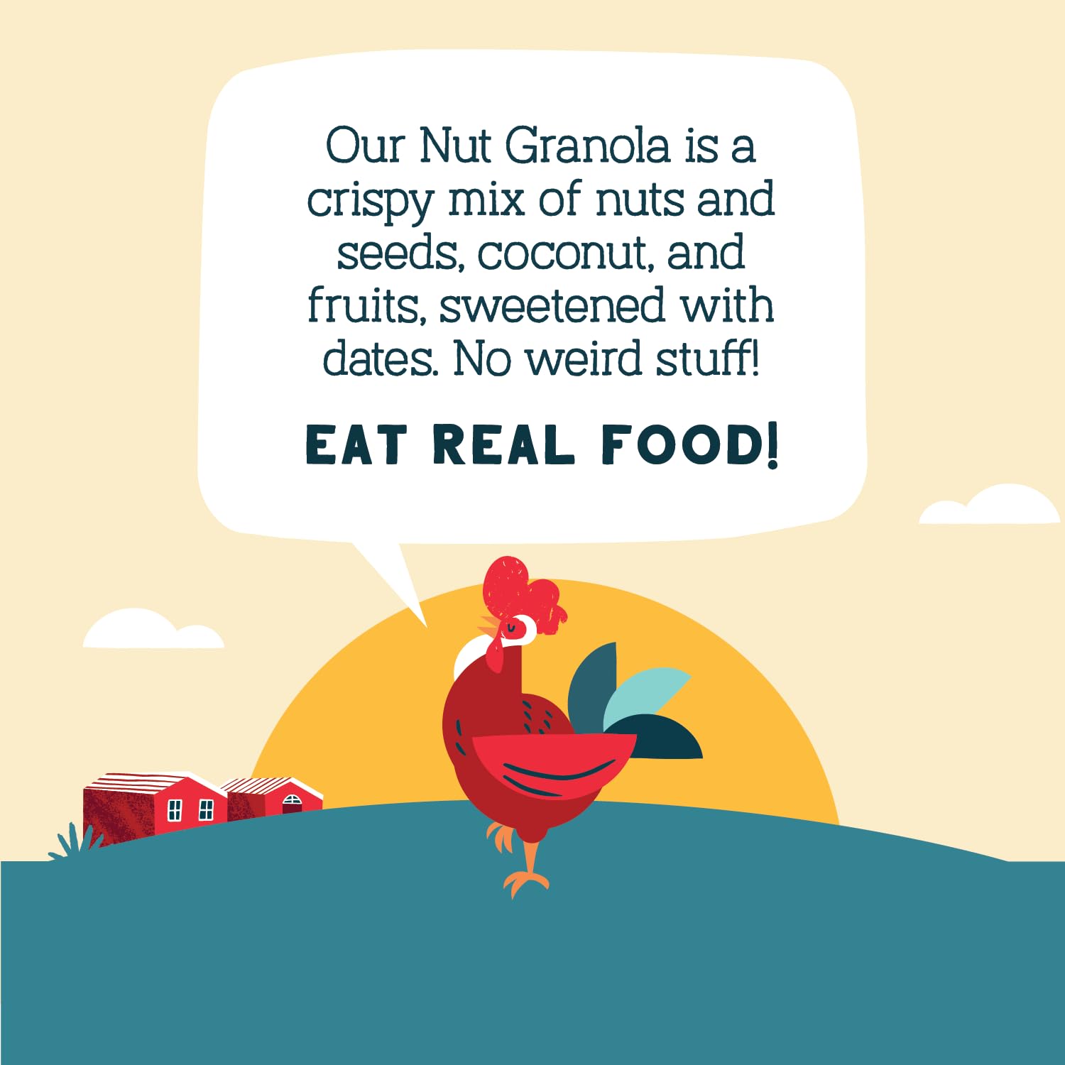 Keep it Real: Our Rise & Shine grain free nut granola is a crunchy-chewy blend of real ingredients like strawberries, bananas, dates and coconut, almonds and pecans, and sunflower, pumpkin, chia and flax seeds | No Weird Stuff Ever: Our certified gluten free granola is also vegan and Non GMO with no artificial flavors. With zero sugar, 5g of plant protein and 5g net carbs, our nut granola is a perfect paleo and keto option | Subtly Sweetened by Nature: Our Nut Granola has the perfect touch of sweetness from natural sweeteners like dates. We left out the sweeteners like Stevia and Erythritol so you can feel great about what's in your bowl | Think Outside the Box: Rise & Shine is delicious any time with a splash of your favorite milk, as a topping for oatmeal, smoothie bowls or yogurt, or right out of the bag for a perfect on-the-go snack | Because We Give a Cluck: We make obsessively clean, real delicious cereals that are good for you and better for the planet. Explore our family of cereals including our Mueslis, Nut Granolas, Sunflower Cereals, Protein Oats and Oat Protein Cereals