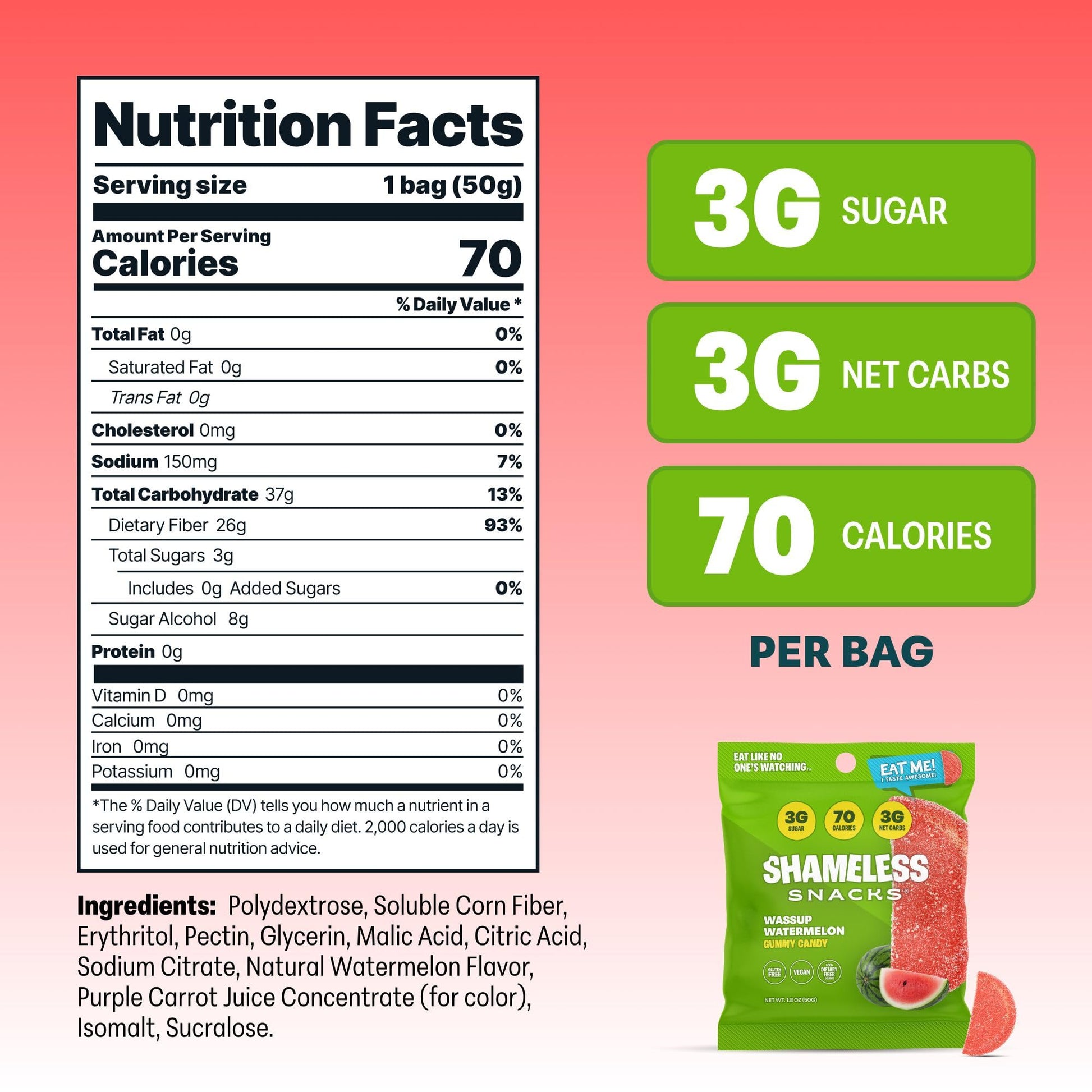 We Designed Shameless Snacks To Have The Same Flavor And Texture Of Your Childhood Favorites But Without All The Sugar And Artificial Junk. One Bag Of Shameless Snacks Gummies Has 70 Calories, Thats 62% Less Calories Than Regular Candy. Next, Compare Our 3G Of Sugar Per Bag To An Average Of 40G Of Sugar In Traditional Gummies Thats 92% Less Sugar! And Unlike Most Other Brands, Shameless Snacks Are Gluten-Free, Keto-Friendly, Vegan, And Made With Real Fruit Flavors & Colors. So Go Ahead, Eat The Whole Bag Guilt-Free!