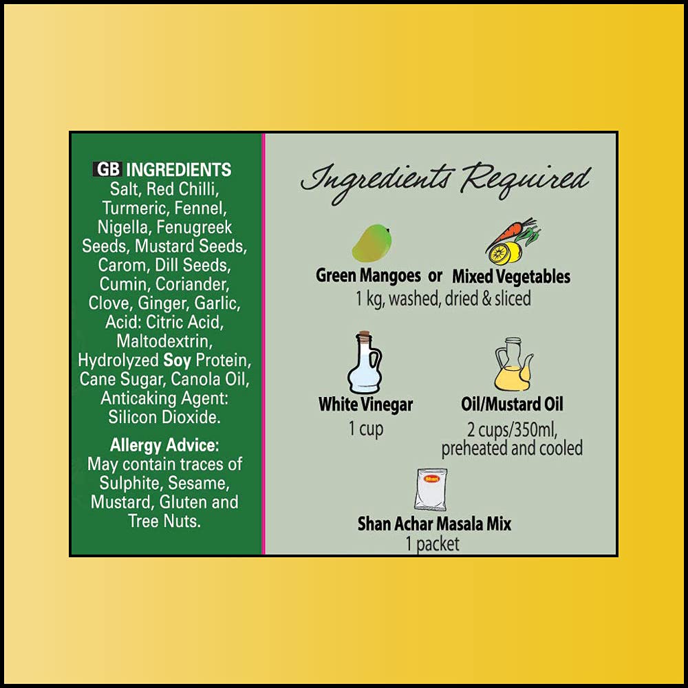 Shan Foods Achar Recipe And Seasoning Mix Is The Perfect Solution For Creating Traditional, Hot, And Spicy Indian Pickles (Achar) With Ease. This Authentic Pickle Spice Blend Contains A Harmonious Mix Of Ingredients Like Red Chili, Turmeric, Coriander, Cumin, Mustard Seed, And More, Making It The Ideal Pickle Seasoning For Those Who Love Homemade Pickles. Whether You'Re Making Spicy Pickle Or Adding A Bold Flavor To Your Canned Goods, This Seasoning Blend Offers A Burst Of Rich, Aromatic Spices. Designed For Easy Use, Shans Pickle Seasoning Mix Ensures That Your Pickles Have The Perfect Balance Of Hot And Spicy Flavors, A Hallmark Of Traditional Indian Cuisine. Crafted From A Combination Of Spices For Pickling, Such As Aniseed, Fenugreek, And Nigella Seed, Each Packet Delivers An Authentic Taste That Captures The Essence Of Sub-Continental Cooking. This Versatile Pickling Spice Blend Is Great For All Types Of Pickles, From Classic Dill Pickles To Tangy Spicy Pickle Seasoning. It Can Also Be Used To Create Your Own Unique Blend Of Canning Spices, Perfect For Pickling A Variety Of Fruits And Vegetables. Enjoy The True Taste Of Homemade Pickles With The Convenience Of Shans Expertly Crafted Recipes. Shan Foods Offers An Easy-To-Follow Recipe On Each Box, Making It A Go-To Choice For Both Experienced Chefs And Newcomers To Indian Cuisine. The Seasoning Mix Is Vegan, Gluten-Free, And Contains No Artificial Colors Or Preservatives, Making It A Healthy Choice For Those Who Prefer Natural Food Options. Elevate Your Pickling Game With Shan Foods' Authentic Pickle Spice Blend And Bring The Flavors Of India To Your Kitchen. Whether You'Re Pickling For Family Meals Or As A Special Gift, Shans Achar Recipe And Seasoning Mix Is Your Go-To For High-Quality, Flavorful Pickling.