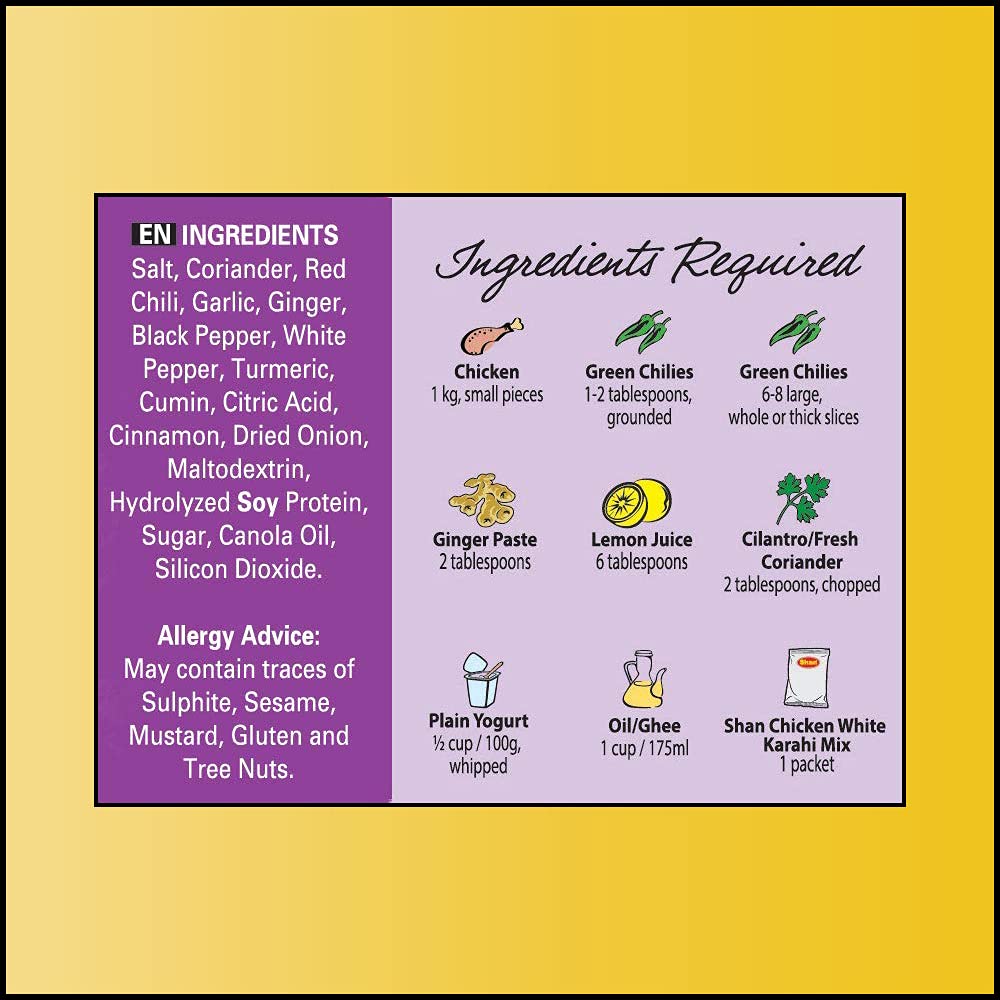 Shan Foods Was A Small Company Established In 1981. Soon It Gained Popularity And Now We Have A Presence In 65 Countries Across 5 Continents.&Nbsp;All Our Products Are Carefully Packaged Under The Most Hygienic Conditions According To International Quality Standard.&Nbsp;All Products Of Shan Foods Are Iso 9001:2015. Shan Foods Is Committed To Make Your Life Easy In The Kitchen And At The Same Time Delighting Your Taste Buds. We Are The Pioneer Of Ready To Make Masala Packets. We Are Continuously Working Hard To Ensure You Can Serve Authentic Pakistani/Indian Food To Your Loved Ones. Each Recipe Is Tailored To Ensure A Delicious Taste Through Our Special Herbs Seasoning And Spices.&Nbsp; Shan Chicken White Karahi Mix Helps You Prepare Delicious And Mouthwatering We Hope You Love It As Much As We Do. Steps Of Cooking: 1. Mix Shan Chicken White Karahi Mix, Green Chili Paste.2. Shan Ginger Paste And Yogurt And Apply It To The Chicken Cubes.3. Marinate For 1-2 Hours. Heat Oil And Add Chicken. Stir Fry On High Heat For 8-10 Minutes.4. Cover And Cook On Low Heat For 5-7 Minutes.5. .Add Lemon Juice, Green Chilies And Green Coriander.