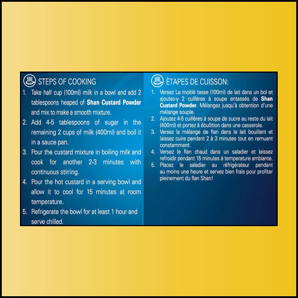 - Q: What is Shan Custard Powder Mango and how is it used? A: Shan Custard Powder Mango is a dessert mix that allows you to quickly prepare a rich and creamy mango custard at home. Simply mix the powder with milk according to the instructions on the packaging, heat it, and enjoy a delicious traditional dessert suitable for any occasion.