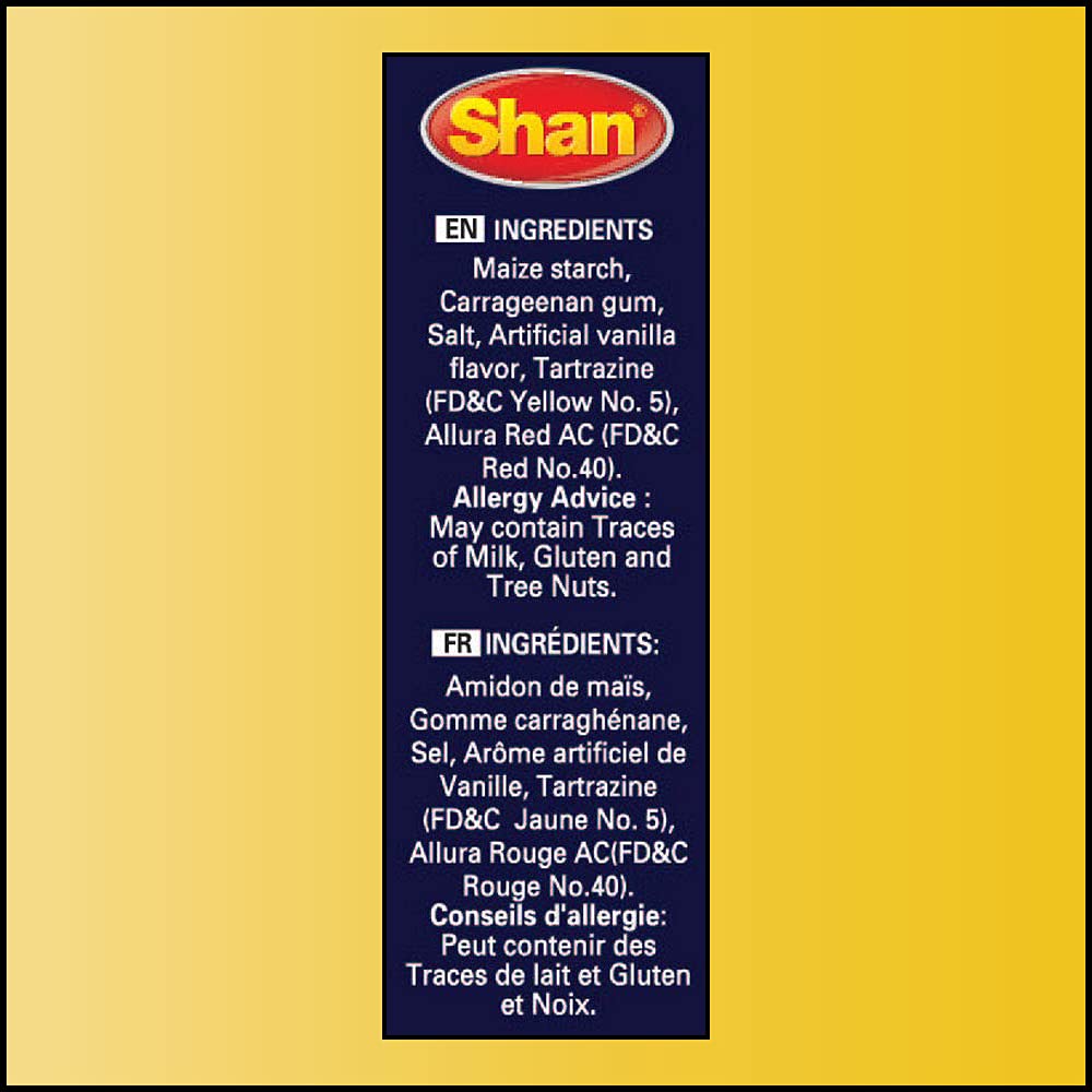 Description: Shan Foods Was A Small Company Established In 1981. Soon It Gained Popularity And Now We Have A Presence In 65 Countries Across 5 Continents.&Nbsp; All Our Products Are Carefully Packaged Under The Most Hygienic Conditions According To International Quality Standard.&Nbsp; All Products Of Shan Foods Are Iso 9001:2015. Shan Foods Is Committed To Making Your Life Easier In The Kitchen And At The Same Time Delighting Your Taste Buds. We Are The Pioneer Of Ready To Make Masala Packets. We Are Continuously Working Hard To Ensure You Can Serve Authentic Pakistani/Indian Food To Your Loved Ones. Each Recipe Is Tailored To Ensure A Delicious Taste Through Our Special Herbs Seasoning And Spices. Shans Traditional Desserts Range Offers Convenience By Allowing Our Consumers To Make Delicious Desserts In The Comfort Of Their Homes. Available In Distinct Variants, Shans Traditional Desserts Offer Something For Every Occasion.Shan Vanilla Custard Provides With Rich, Creamy And Delicious Custard That The Whole Family Can Enjoy.