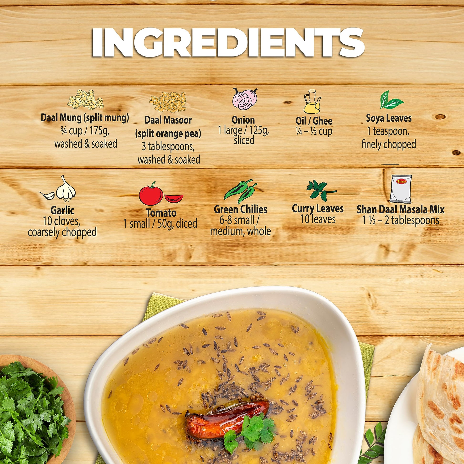 1. Heat half oil and stir fry the onions for few minutes. Add Shan Daal Masala Mix and garlic. 2. Add lentils, tomato, soya leaves, green chilies and 6 cups of water. Boil on low heat until the daal is tender and smooth (about 30 minutes). 3. Heat the remaining ghee / oil and stir fry the curry leaves for few seconds and pour over the cooked lentil curry. Cover and cook on low heat for 15-20 minutes.