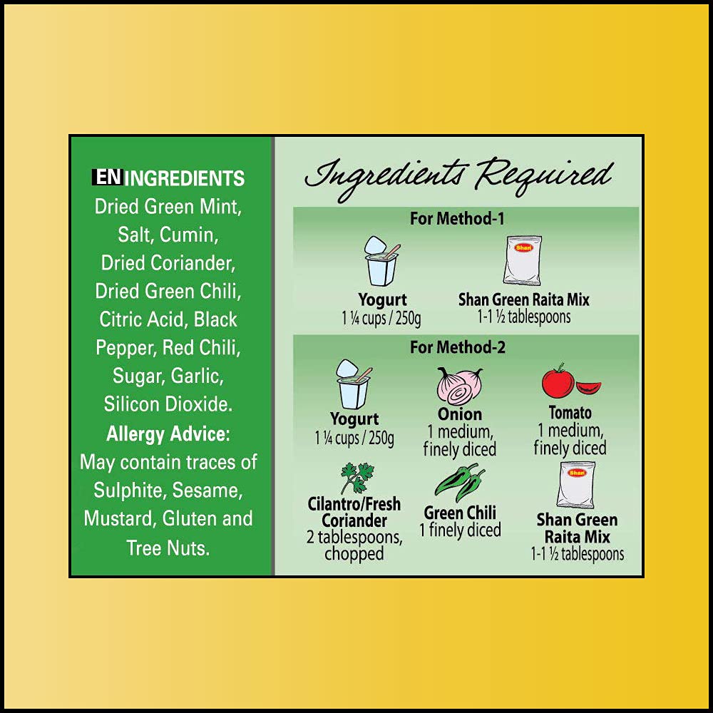 - Q: How do you prepare raita using Shan Green Raita seasoning? A: To prepare raita, simply mix the seasoning with yogurt according to the instructions provided on the back of the box, and serve chilled.