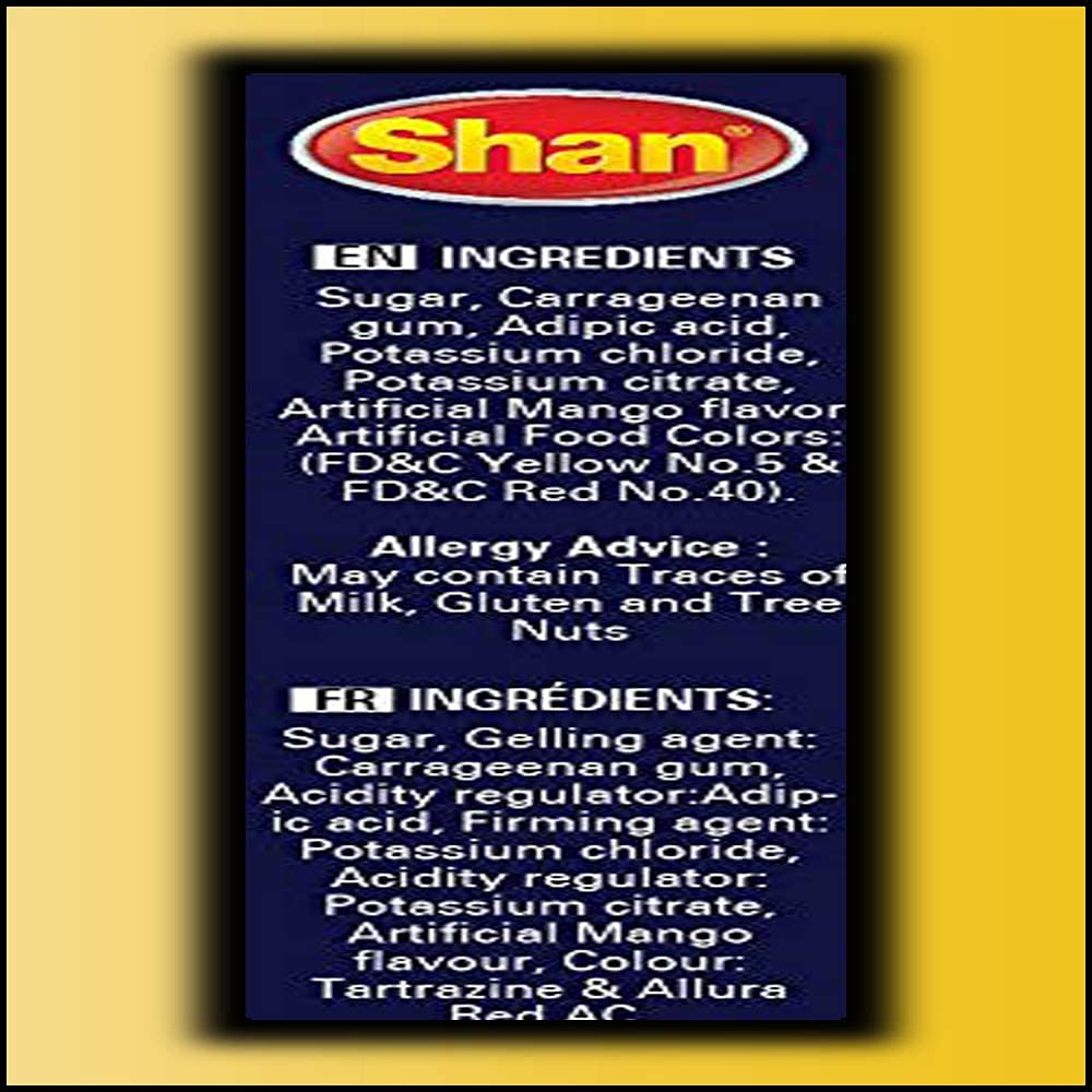 - Q: What are Shan Jelly Crystals Mango made of? A: Shan Jelly Crystals Mango are made from ingredients including sugar, carrageenan gum, adipic acid, potassium chloride, potassium citrate, artificial mango flavor, and artificial food colors like FD&C Yellow No. 5 and FD&C Red No. 40.