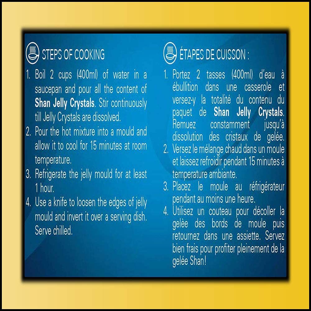 - Q: How do I prepare Shan Mango Jelly? A: To prepare Shan Mango Jelly, dissolve the jelly crystals in boiling water, stir until fully dissolved, and then pour into a mold or container to set. Allow it to cool and refrigerate until firm.