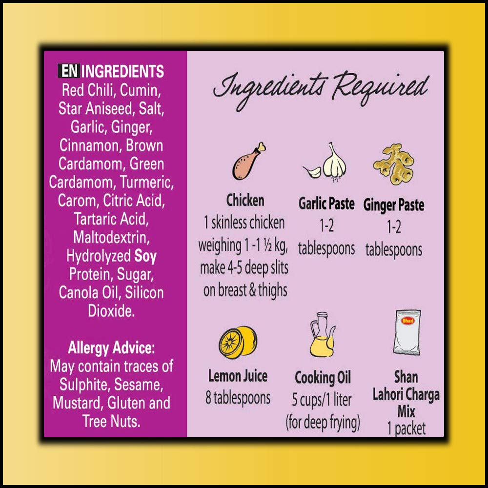 - Q: How do I use Shan Lahori Chargha Mix? A: To use Shan Lahori Chargha Mix, mix garlic, ginger, lemon juice, and the seasoning mix. Apply it evenly over the chicken and marinate for at least three to four hours or overnight. Steam the chicken until tender, then deep fry until golden brown.