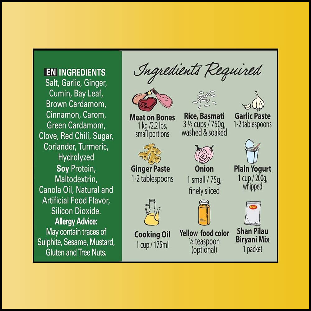 - Q: Is the Shan Pilau Biryani Seasoning Mix easy to prepare? A: Yes, the Shan Pilau Biryani Seasoning Mix is very easy to prepare. All the necessary ingredients and clear instructions are included on the back of the box, allowing you to create a flavorful Biryani without the need for multiple spices.