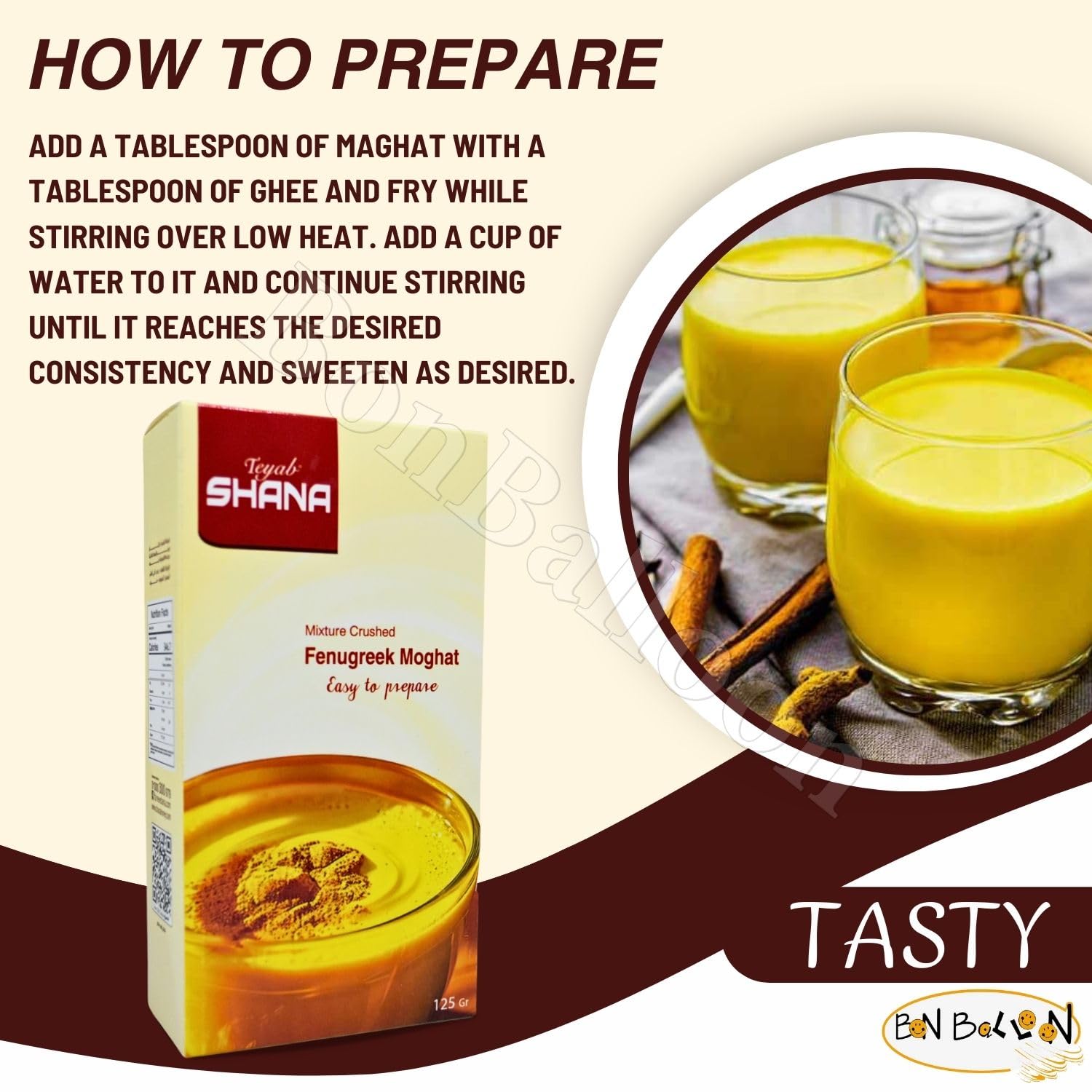 Q: How do I prepare Shana Mixture Crushed Fenugreek Moghat?A: To prepare, add a tablespoon of ghee and a tablespoon of butter in a pan and fry while stirring over low heat. Then, add a cup of water and continue stirring until you reach your desired consistency. Sweeten to taste if desired.