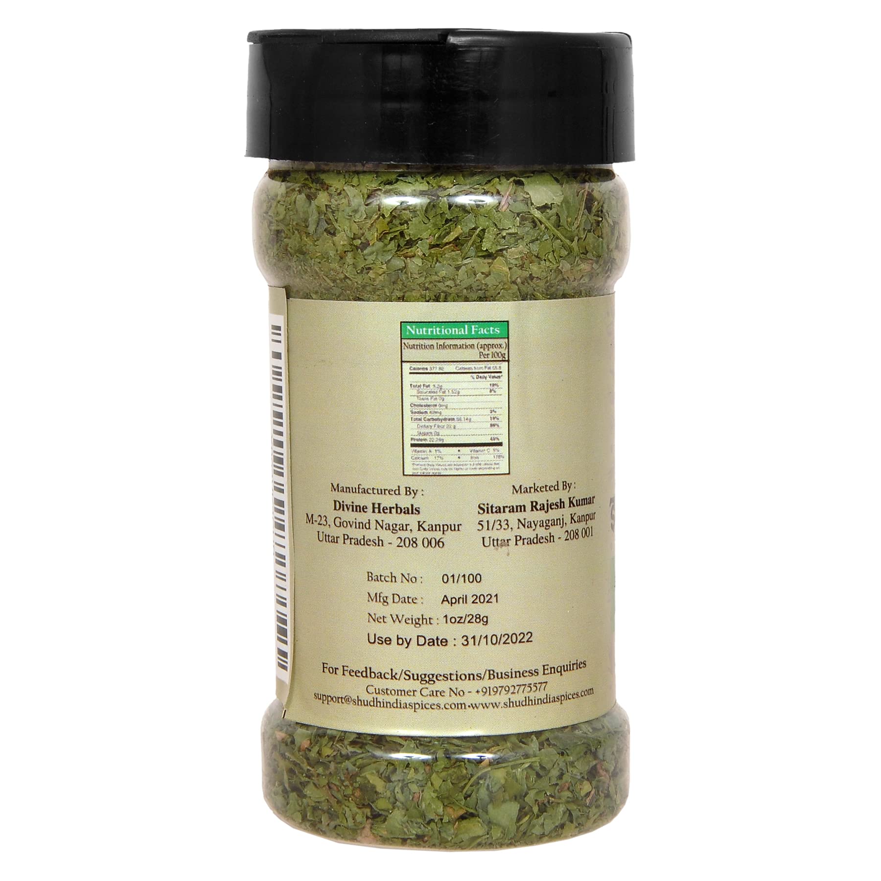 Introducing Shudh India Dried Fenugreek Leaves (Kasuri Methi), a ground spice that brings the authentic flavors of Indian cuisine to your dishes. These dried fenugreek leaves are all-natural, salt-free, vegan, and free from artificial colors, making them a healthy and flavorful addition to your meals. With Indian origin, this product ensures an authentic and high-quality spice experience. Shudh India Dried Fenugreek Leaves (Kasuri Methi) are known for their distinct aroma and robust flavor. Fenugreek leaves are commonly used in Indian cooking to add a unique and savory taste to a variety of dishes. The leaves have a slightly bitter, earthy, and nutty flavor that complements curries, stews, sauces, and vegetable preparations.It is also suitable for vegans, providing a plant-based seasoning option for your culinary creations. The product is free from artificial colors, ensuring that you get the true natural essence of fenugreek leaves. With its Indian origin, this ground spice captures the authentic flavors of Indian cuisine. It is a staple ingredient in many Indian dishes, adding depth, complexity, and a unique aroma. The ground fenugreek leaves are easy to use and can be added directly to your recipes, providing convenience and enhancing the overall flavor profile. Choose Shudh India Dried Fenugreek Leaves (Kasuri Methi) for its all-natural, salt-free, vegan, gluten-friendly, non-GMO, and Indian origin qualities. Elevate your cooking with this versatile ground spice that brings the essence of fenugreek leaves to your favorite dishes, providing an authentic