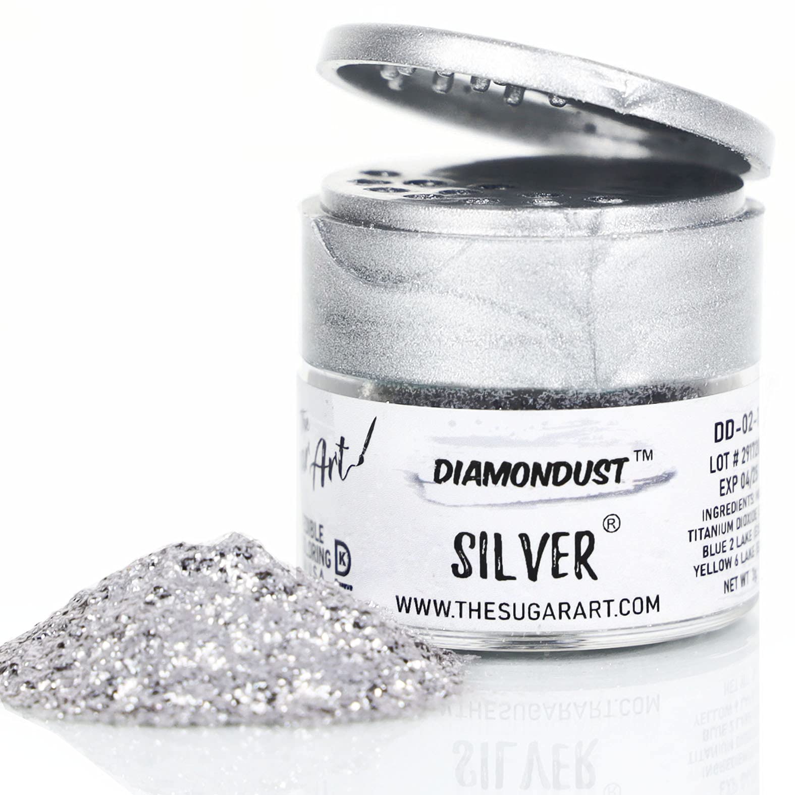 The Sugar Art - DiamonDust Edible Glitter - SilverSprinkle on sparkle, and bring luster to sweets with The Sugar Art's DiamonDust!The Original Kosher Edible Glitter Kosher Certifed from Dallas, Texas, The Sugar Art's gourmet DiamondDust is the original 100% Kosher (Parve) edible glitter. It is made using only FDA certified food colorings without any added sugar or flavors. This vibrant, edible food glitter elevates cakes, cupcakes, and other gourmet baked goods by giving them a stunning silver shimmer safe for consumption! Vegan & Allergen Friendly Unlike other cake decorations and food glitter, ours uses only the highest-quality, vegan ingredients free of gluten and common food allergens such as nuts and dairy. Everyone can enjoy DiamonDust regardless of diet or food allergies! How To UseMake your cakes and gourmet sweets pop! To add sparkle to your sugar art, sprinkle dry DiamonDust over the area you wish to accentuate. To retain this food glitter's unique lustrous shine, apply dry and do not mix with liquid.DiamonDust FeaturesEdible GlitterKosher (Parve)VeganGluten-, Nut-, and Dairy-FreeNo Added Sugar and FlavoringsFDA Compliant Food ColoringSafe for ConsumptionAdds Sparkle and Shine to Gourmet SweetsMade in the USASilver Ingredients: Mica, Titanium Dioxide (E171),Yellow 6 Lake (E110), Blue 2 Lake (E132)Available in 3 gram and 35 gram Sizes